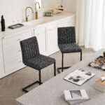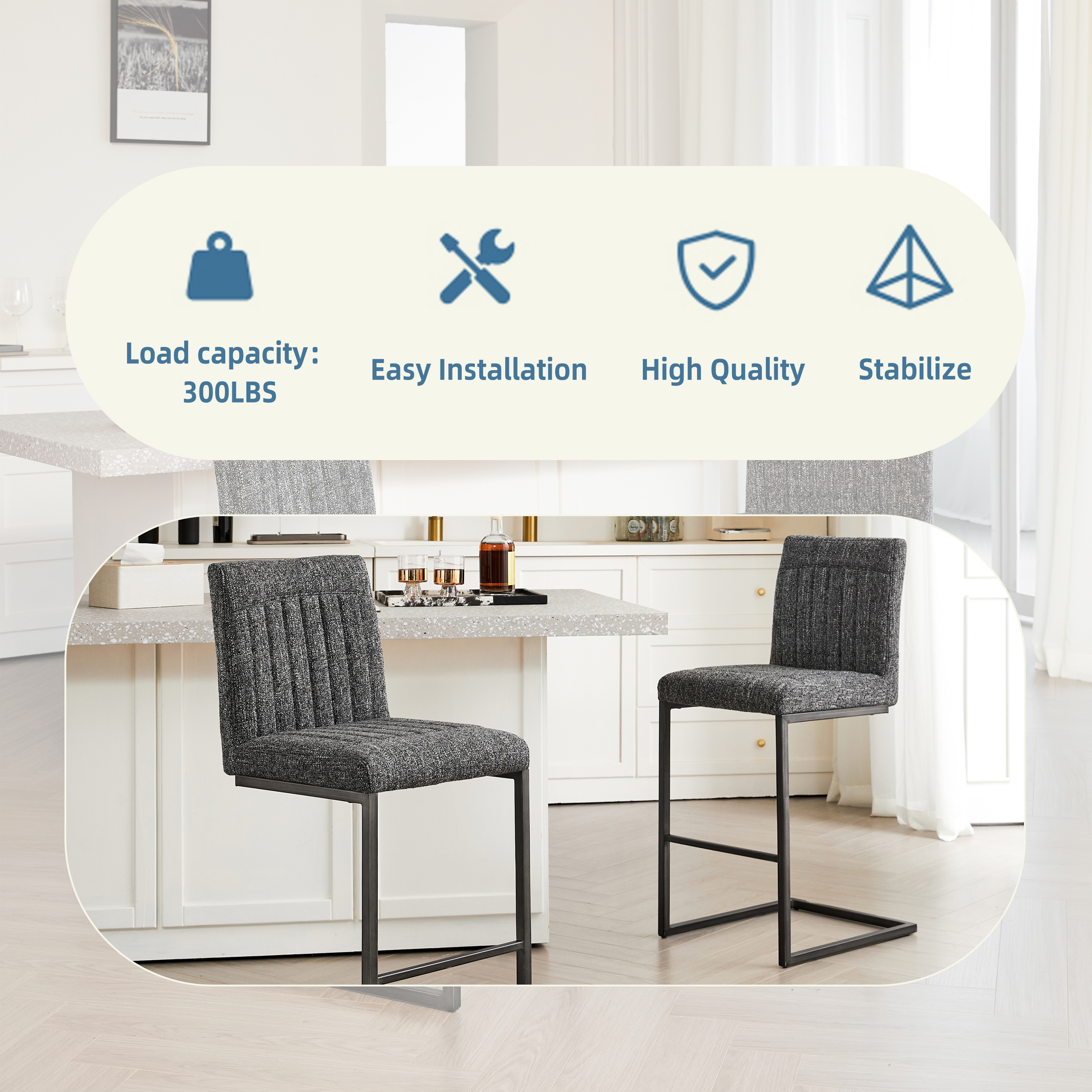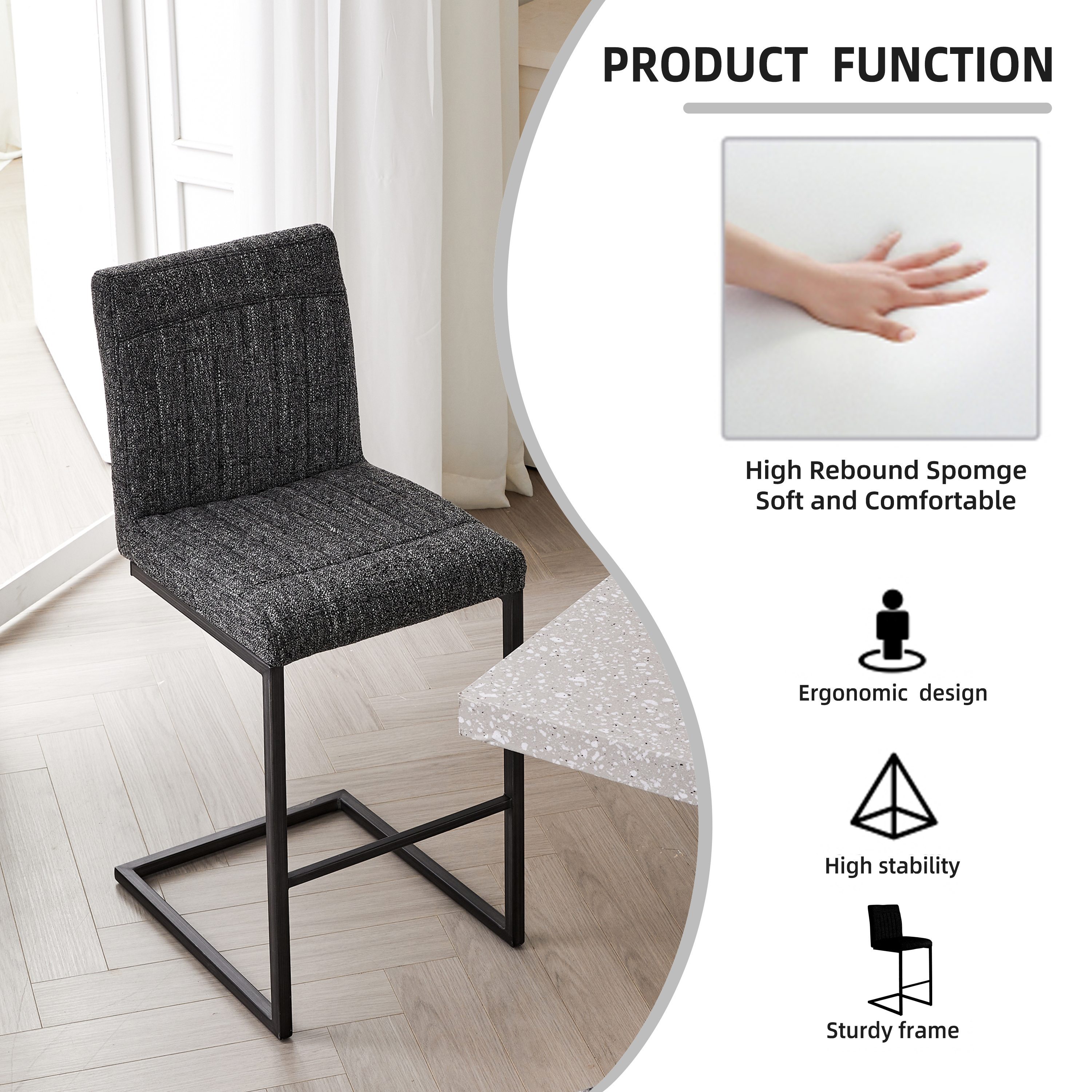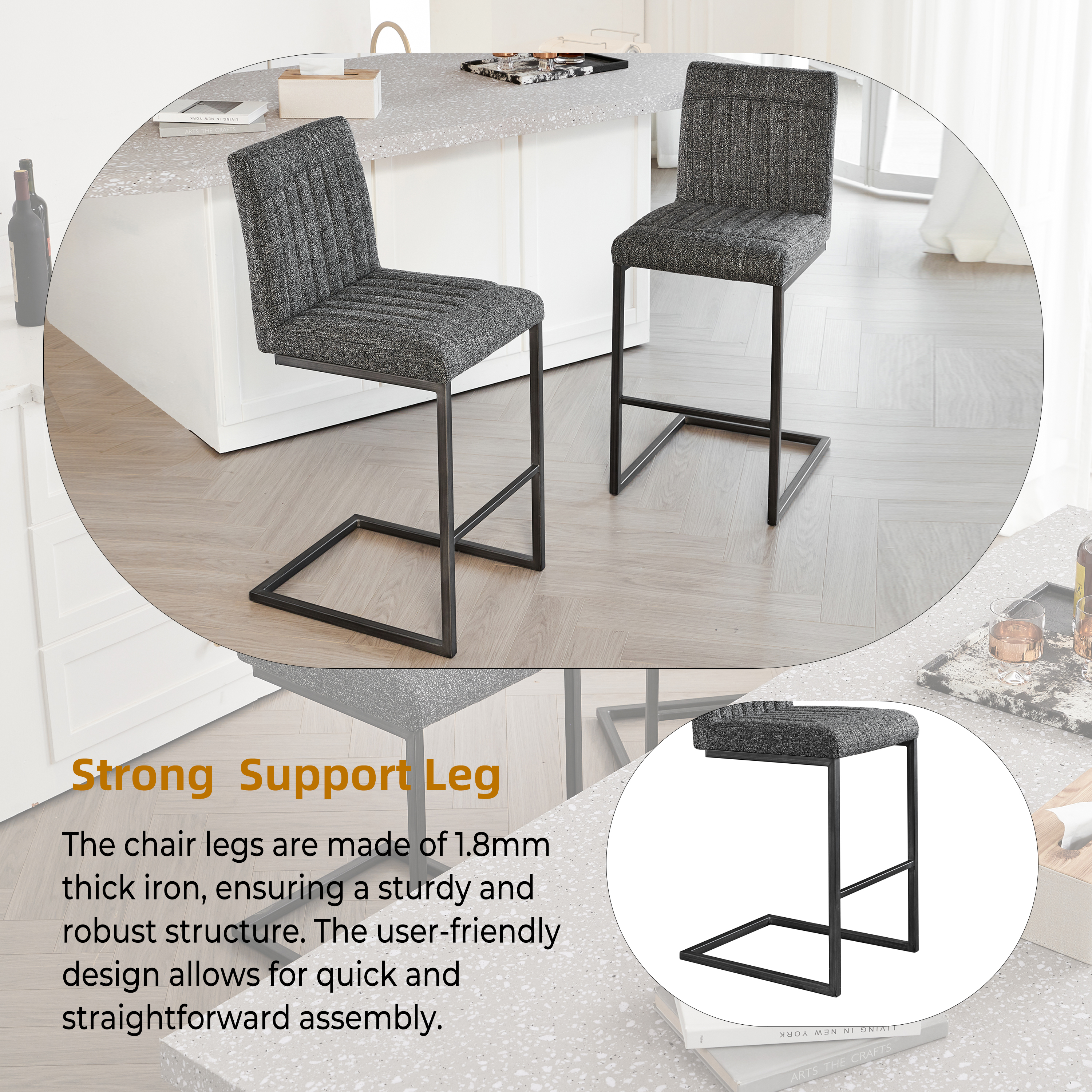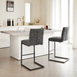 - W5096P400650Product type:Single Box ProductProduct Name:Bar Stool – Speckled Gray Textured Fabric with Vertical Tufted Backrest, , Sturdy Black Metal Frame & Footrest for Kitchen Island & Home Bar,2 SetsColor:Dark GrayMaterial:Fabric+MetalFilling:FoamProduct style:American Design,Contemporary,European,Minimalist,ModernApplicable scenarios:Dining RoomDecorative material:Faux LeatherFrame material:MetalChair features:ErgonomicInterior color:GreyChair shape:SquareChair use case:Bar Stools & Counter StoolsProduct sizeAssembled length (inches):20.88Assembled width (inches):16.55Assembled height (inches):39.20Product weight (pounds):32.78Packaging sizeLength (inches):25.61Width (inches):22.85Height (inches):18.12Weight (pounds):39.38Product featuresThis 26-inch counter height bar stool features premium speckled gray textured fabric upholstery that’s soft to the touch yet resistant to daily spills and minor scratches, paired with a vertical tufted backrest that fits the natural curve of your lumbar—perfect for lingering over morning coffee at the kitchen island or chatting with friends at the home bar without back fatigue.Built with a heavy-duty black metal frame reinforced with crossbars, this bar stool offers exceptional stability and can safely support up to 250 lbs; the integrated footrest provides a comfortable spot to rest your legs, while the matte metal finish resists rust and wear, ensuring long-lasting reliability for high-traffic residential or light commercial use.The unique speckled gray textured fabric and vertical tufted backrest blend modern charm with subtle texture, making this bar stool a stylish addition to industrial, minimalist, or casual home decors—its 18-inch wide seating surface offers ample space for comfort, while the compact metal base fits seamlessly into small kitchen corners or home bar setups without cluttering the area.Designed for hassle-free daily use, this bar stool’s one-piece upholstered seat and backrest eliminate hard-to-clean gaps where crumbs or dust accumulate; the textured fabric is easy to maintain with just a damp cloth, and the sturdy metal frame’s anti-wobble design ensures a steady seating experience, even when leaning back to reach for drinks or snacks.
