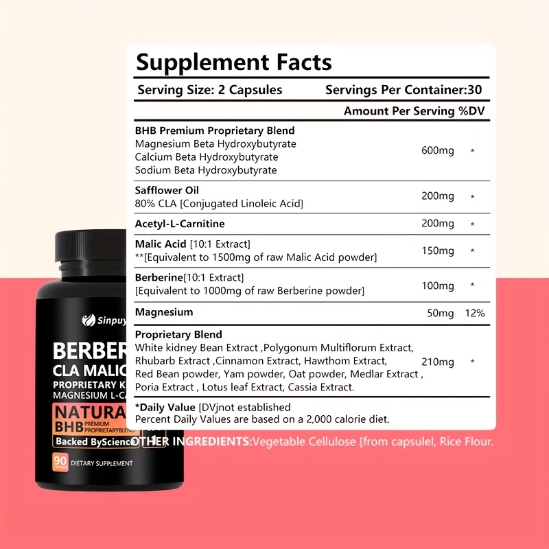 • The Sinpuyle Berberine 20 in 1 Keto BHB Supplement is a comprehensive dietary supplement formulated to support your metabolism and energy levels. This premium proprietary blend features natural BHB and is backed by science, combining key ingredients such as Berberine, CLA, Malic Acid, Magnesium, and L-Carnitine. Each bottle contains 90 capsules, offering a convenient way to incorporate these beneficial components into your daily routine for overall wellness support.