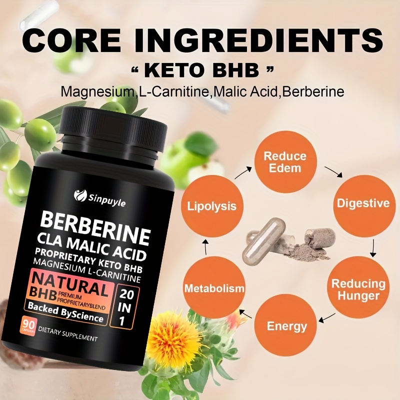 The Sinpuyle Berberine 20 in 1 Keto BHB Supplement is a comprehensive dietary supplement formulated to support your metabolism and energy levels. This premium proprietary blend features natural BHB and is backed by science, combining key ingredients such as Berberine, CLA, Malic Acid, Magnesium, and L-Carnitine. Each bottle contains 90 capsules, offering a convenient way to incorporate these beneficial components into your daily routine for overall wellness support. • Sinpuyle brand supplement • Features Berberine