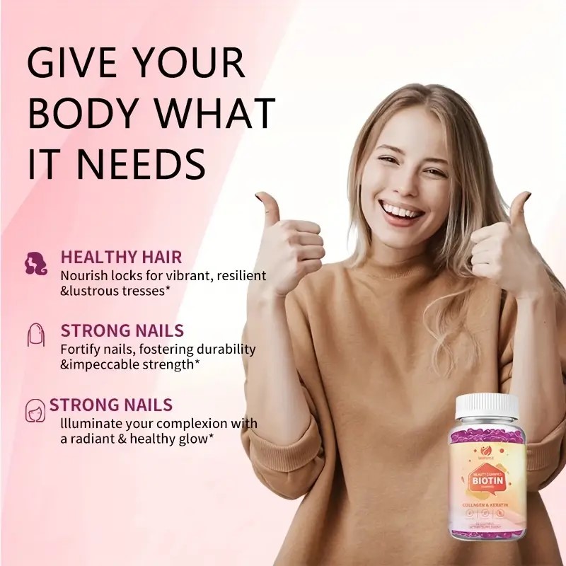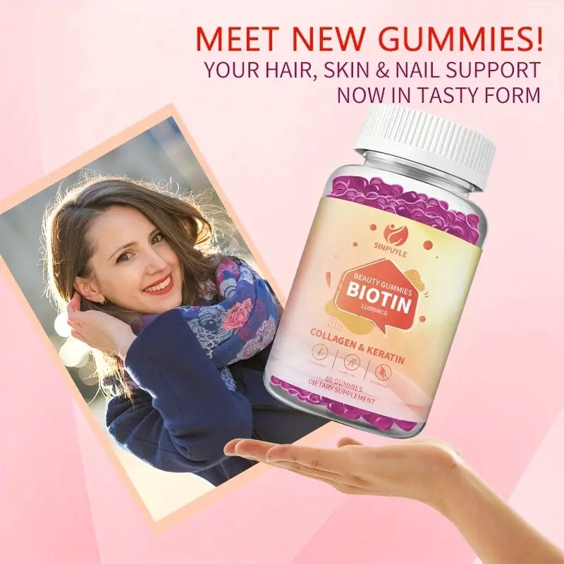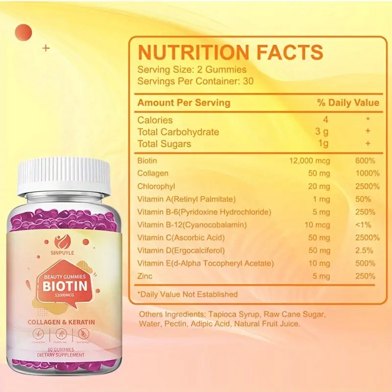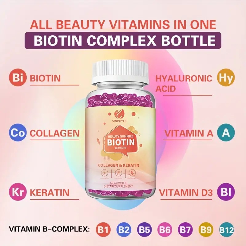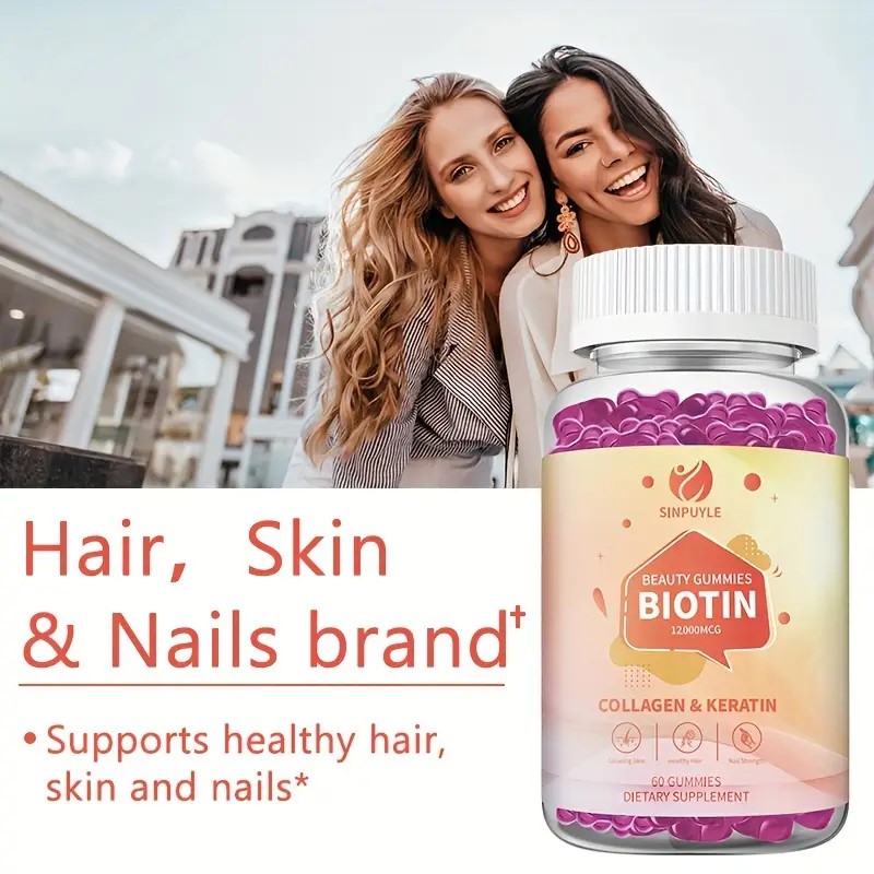 • These SINPUYLE Beauty Gummies are formulated with a potent 12000MCG of Biotin, combined with Collagen and Keratin, to offer comprehensive support for your hair, skin, and nails. Each bottle contains 60 delicious gummies, providing a convenient dietary supplement designed to help maintain healthy hair, promote radiant skin, and strengthen nails. This blend is an easy way to incorporate essential nutrients into your daily routine for overall beauty support.