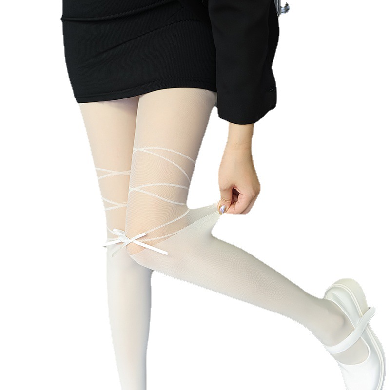 Black & White Cross Strap Bow Tights, Sheer Bandage Style Pantyhose, Coquette Aesthetic Legwear For Women