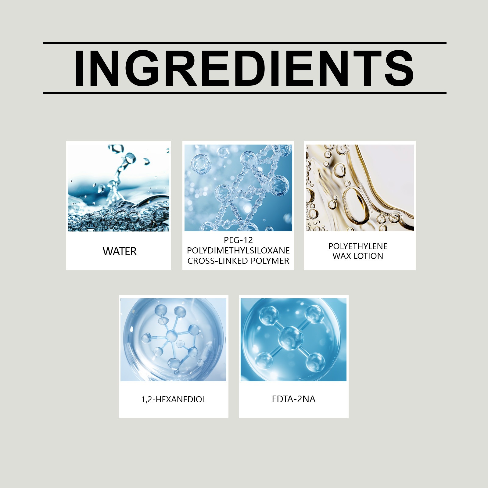 - Water, PEG-12 polydimethylsiloxane crosslinked polymer, polyethylene wax emulsion, 1,2- hexanediol, EDTA-2Na.