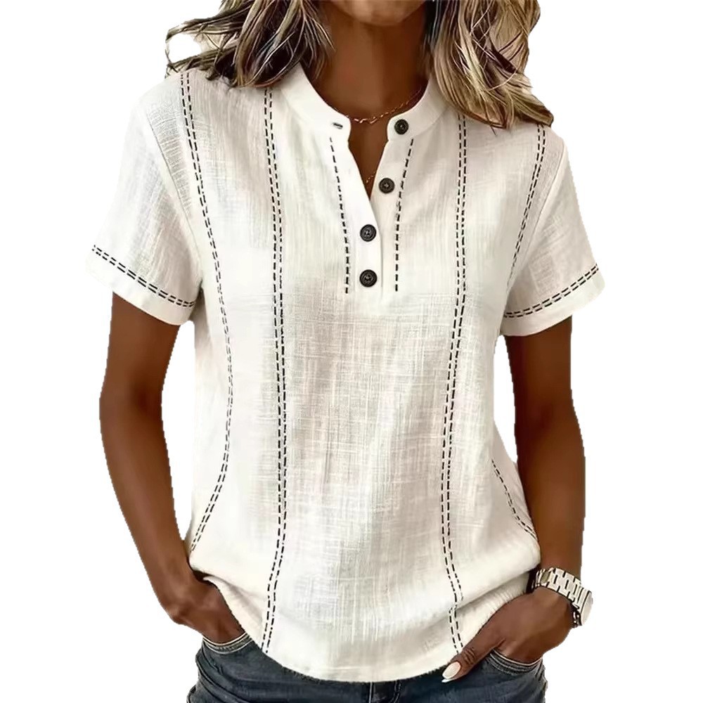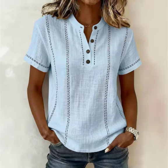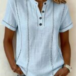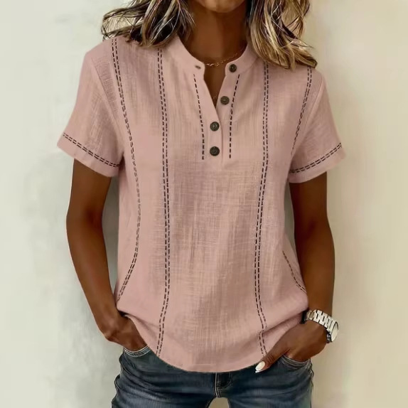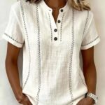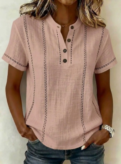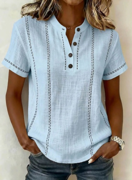 Casual Short-Sleeve Stand-Collar Solid-Color Patchwork Womens Shirt is designed for style, comfort, and everyday use.