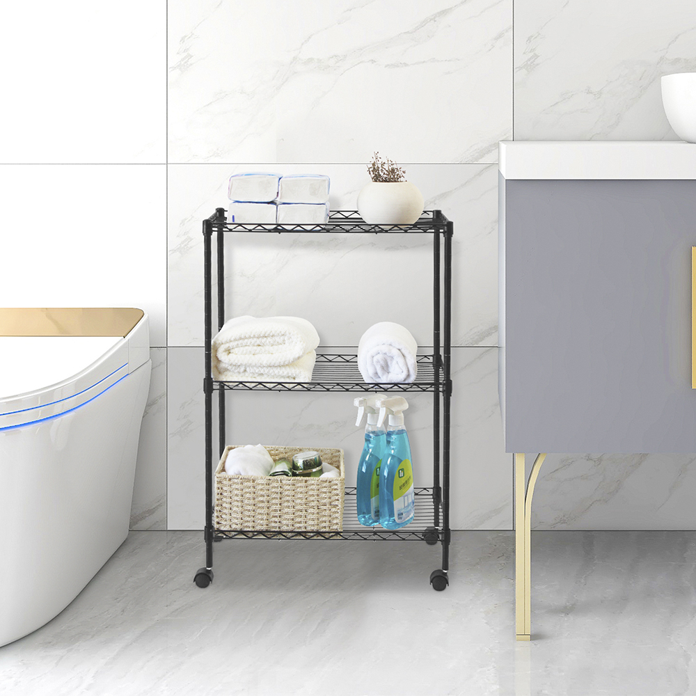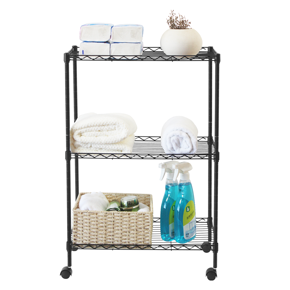 • Organize your home, laundry room and work space effortlessly with the  3-Tier Shelving All-Purpose Utility Cart. Made with chrome plated steel, the utility cart is ideal for any environment as the casters provide convenience of transporting objects with ease. Each shelf can hold up to 150 lbs and the raised borders on the shelves keep items intact without falling or rolling off. The shelves are height adjustable to provide versatility to accommodate the size of the objects. The 3-Tier Shelving All Purpose Utility Cart is the perfect addition to any home, laundry room or work environment.
