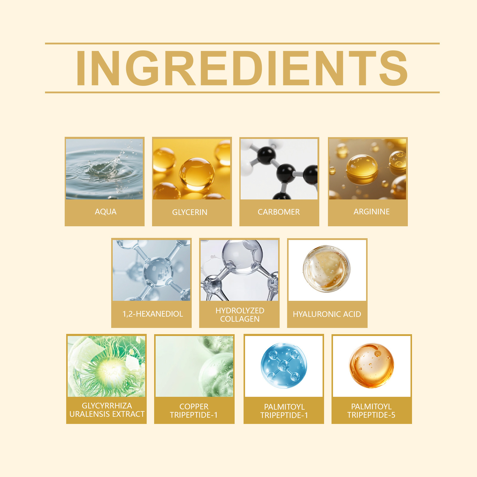 • Water, Glycerin, 1,2-Hexanediol, Carbomer, Arginine, Hydrolyzed Collagen, Hyaluronic Acid, Licorice Extract, Tripeptide-1 Copper, Palmitoyl Tripeptide-1, Palmitoyl Tripeptide-5