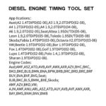 1.Timing tool kit is a professional tool for installing or removing diesel engine camshaft/variable camshaft timing device for checking and adjusting engine timing. • 2. for VW Audi compatible, suitable for SEAT SKODA equipped 1.9L 2.0L TDI PD DOHC engine. • 3. Forged from engineering steel, well made, strong and durable, anti-corrosion and anti-rust, long service life, high cost performance.