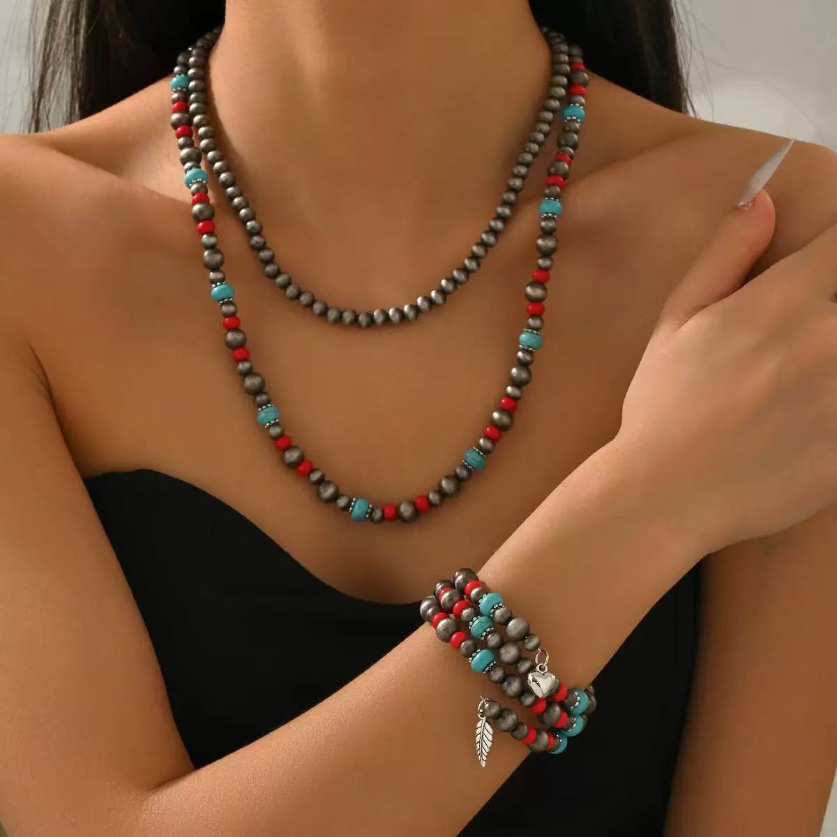 Cross-border New Earrings And Necklace 2-piece Set Fashion Turquoise Beaded Earrings And Necklace