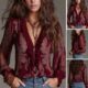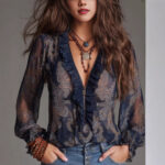 Deep V-neck Paisley Ruffle Chiffon Blouse