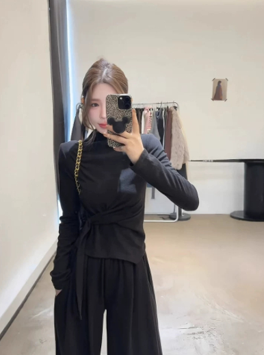 Design-inspired Strap-wrapped Fitted Long-sleeved Top With Wide-leg Pants Set