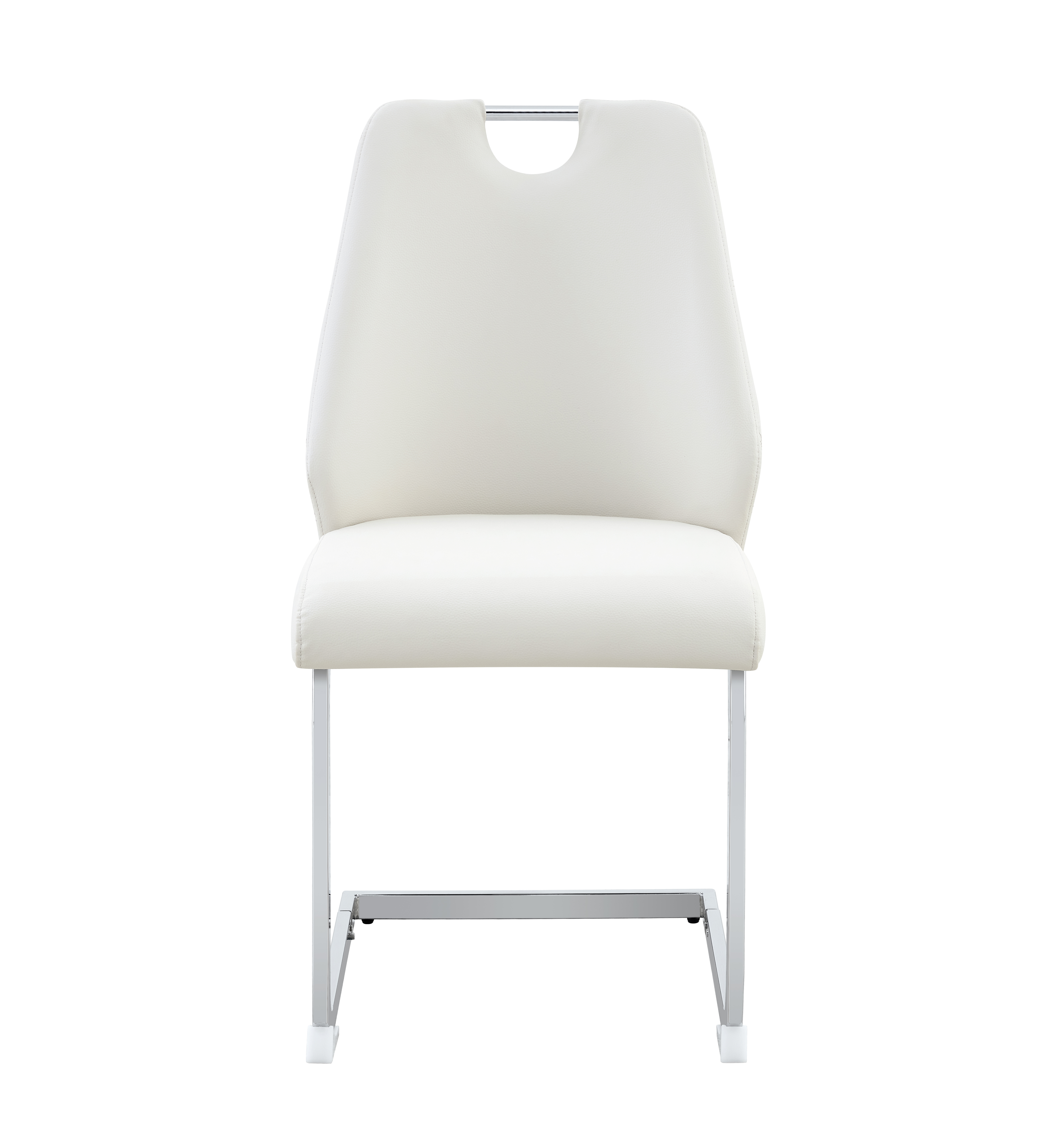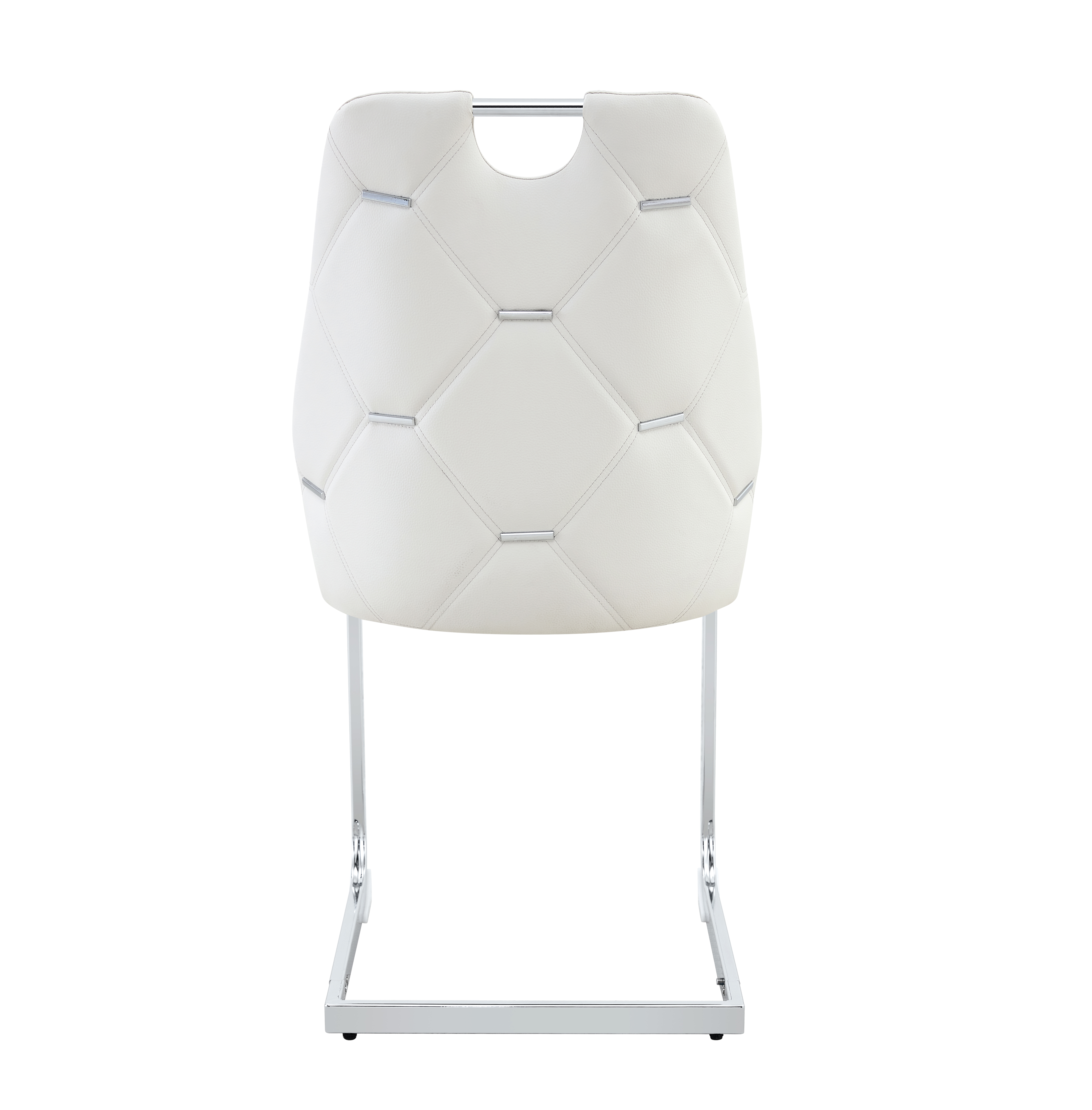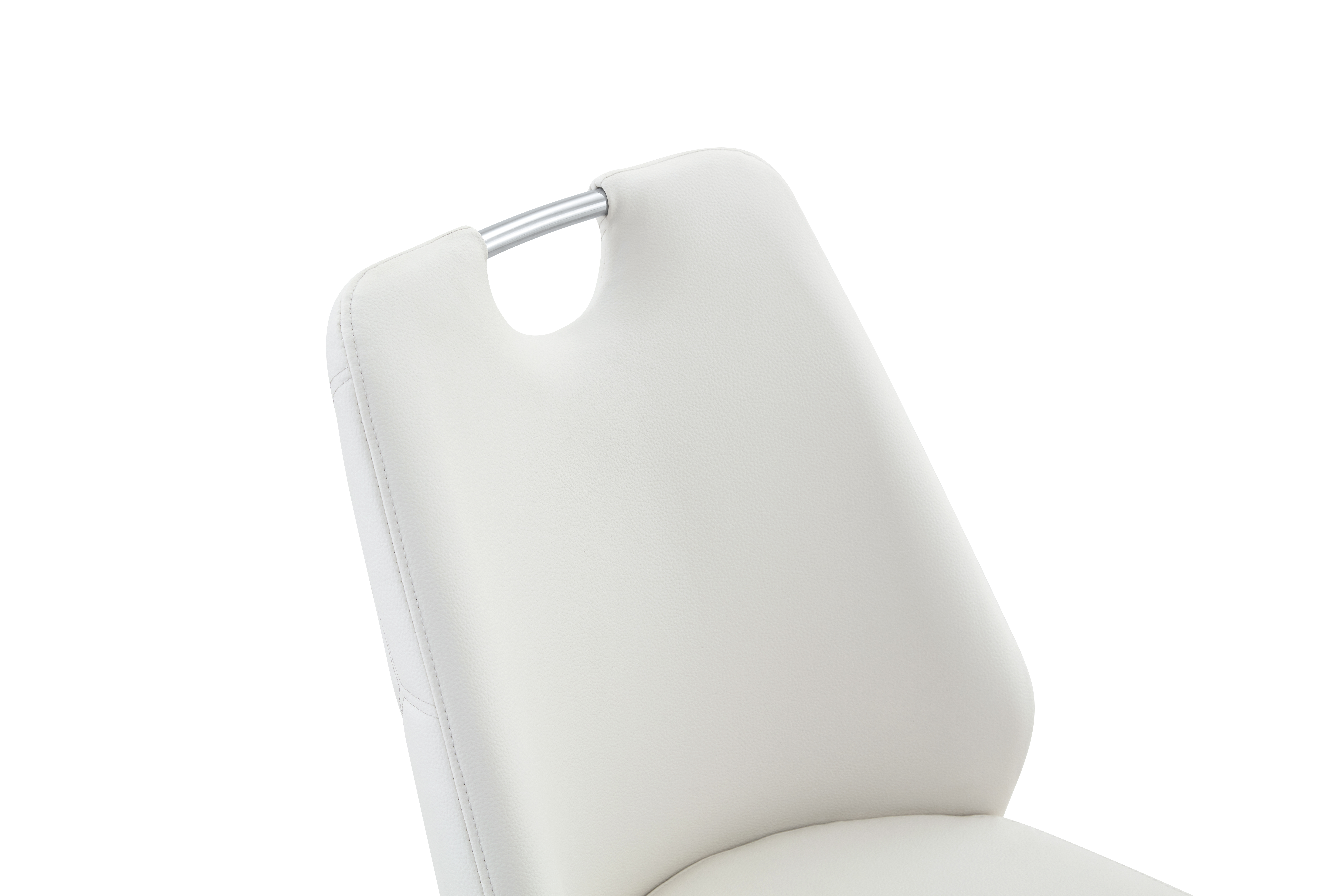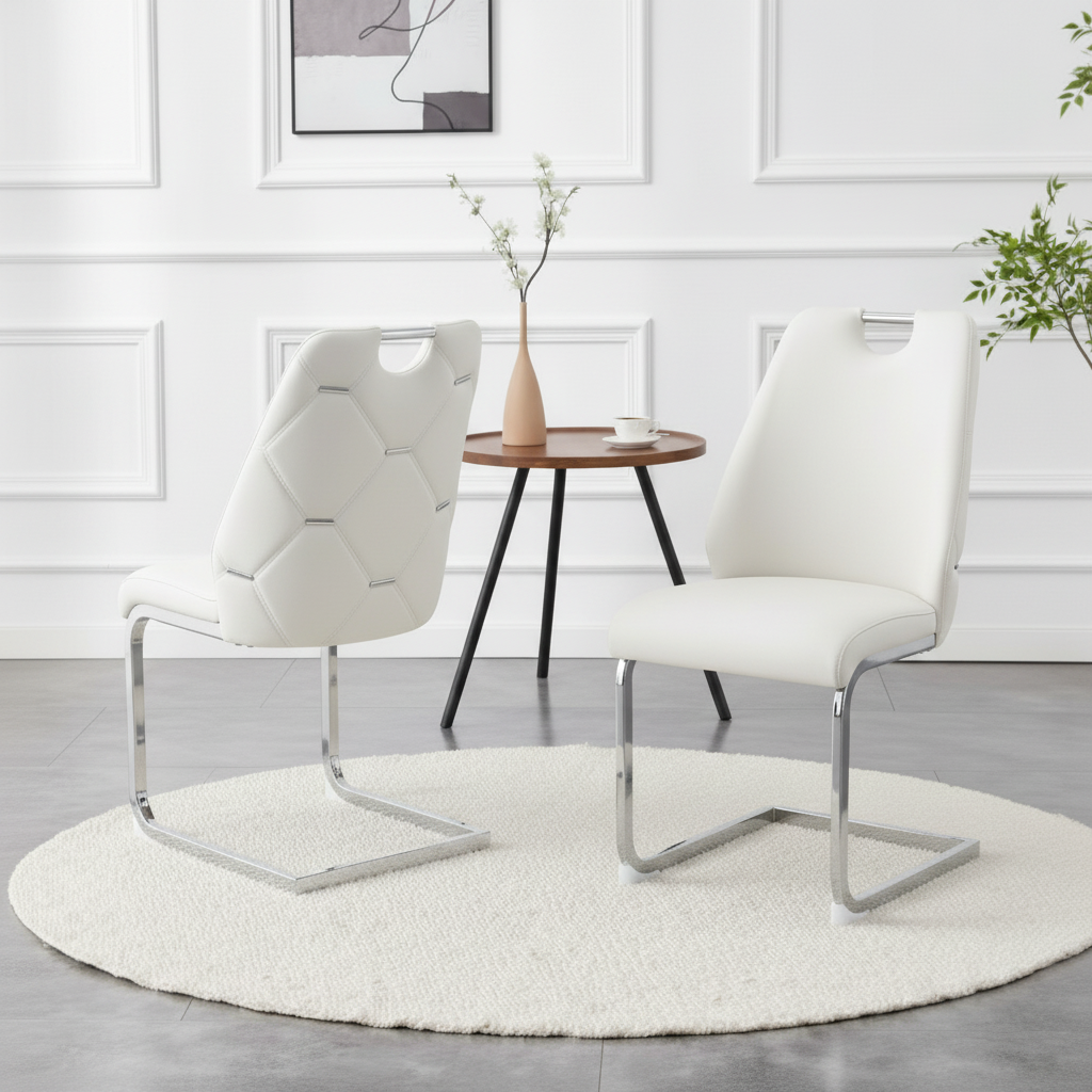 Single Box ProductProduct Name:Dining Chairs Set of 2, White Faux Leather Kitchen Chairs with Gold Mesh Texture, Silver Back Ring and Chrome Pull Handle, High Back Upholstered Dining Room Chair ( White, Set of 2)Place of Origin:ChinaMain Color:WhiteMain Material:PUFiller:FoamProduct Style:ModernUse Case:Dining RoomChair Type:Dining ChairsPattern:SolidChair Back Style:Solid BackChair Upholstery Material:MetalChair Shape:RectangularChair Finish Type:PaintedChair Fill Material:FoamChair Care Instructions:Wipe CleanSeating Quantity:Set of 2Product DimensionsAssembled Length (in.):17.72Assembled Width (in.):35.83Assembled Height (in.):21.26Product Weight (lbs.):14.55Package SizeLength (in.):23.62Width (in.):16.93Height (in.):18.50Weight (lbs.):31.97Product Features【Premium PU Leather Material】Crafted from high-quality PU leather, the upholstery features a fine texture with clear natural grain. It feels soft yet firm to the touch, giving your dining area a refined and luxurious look.【Waterproof & Scratch Resistant】The PU leather surface is waterproof, stain-resistant, and pet-friendly, making daily maintenance easy. Simply wipe clean to remove spills or stains — no fading or cracking even after long-term use.【Comfortable High-Resilience Cushion】The seat is filled with high-density rebound foam, providing long-lasting comfort and excellent support. It retains its shape even after extended sitting, perfect for dining, working, or relaxing.【Elegant Arched & Rivet Design】The arched backrest and geometric stitching with decorative rivets bring modern sophistication to your space. The metal hollow handle adds both functionality and a stylish finishing touch.【Strong Iron Frame & Stability】Constructed with a solid iron base, the chair ensures superior load-bearing capacity and stability. Its robust structure is designed for everyday durability and long-term reliability.【Protective Non-Slip Foot Pads】Each chair leg features anti-slip foot pads that prevent scratches on floors, reduce noise, and provide stability even on uneven surfaces — ideal for hardwood, tile, or laminate floors.【Easy Assembly & Anti-Loosening Screws】Assembly is quick and simple with included tools and instructions. The screws are coated with anti-slip protection, ensuring a secure fit that won’t loosen over time.DescriptionsModern PU leather dining chairUpgrade your home with this modern PU leather dining chair set, combining elegance, comfort, and durability. Upholstered in premium PU leather, it features a smooth texture with clear natural grain that’s waterproof, stain-resistant, scratch-resistant, and pet-friendly — easy to clean and long-lasting. The high-resilience foam cushion ensures superior comfort and shape retention, perfect for long dinners or work sessions. A unique arched backrest with geometric stitching, rivet accents, and a hollow metal handle adds both beauty and function. Supported by a sturdy iron frame, this chair provides excellent stability and strong weight capacity. The non-slip foot pads protect floors, reduce noise, and enhance balance. Quick to assemble, with anti-loosening screws ensuring lasting durability. Ideal for dining rooms, kitchens, offices, or lounges, this chair brings modern sophistication and reliable comfort to any space.