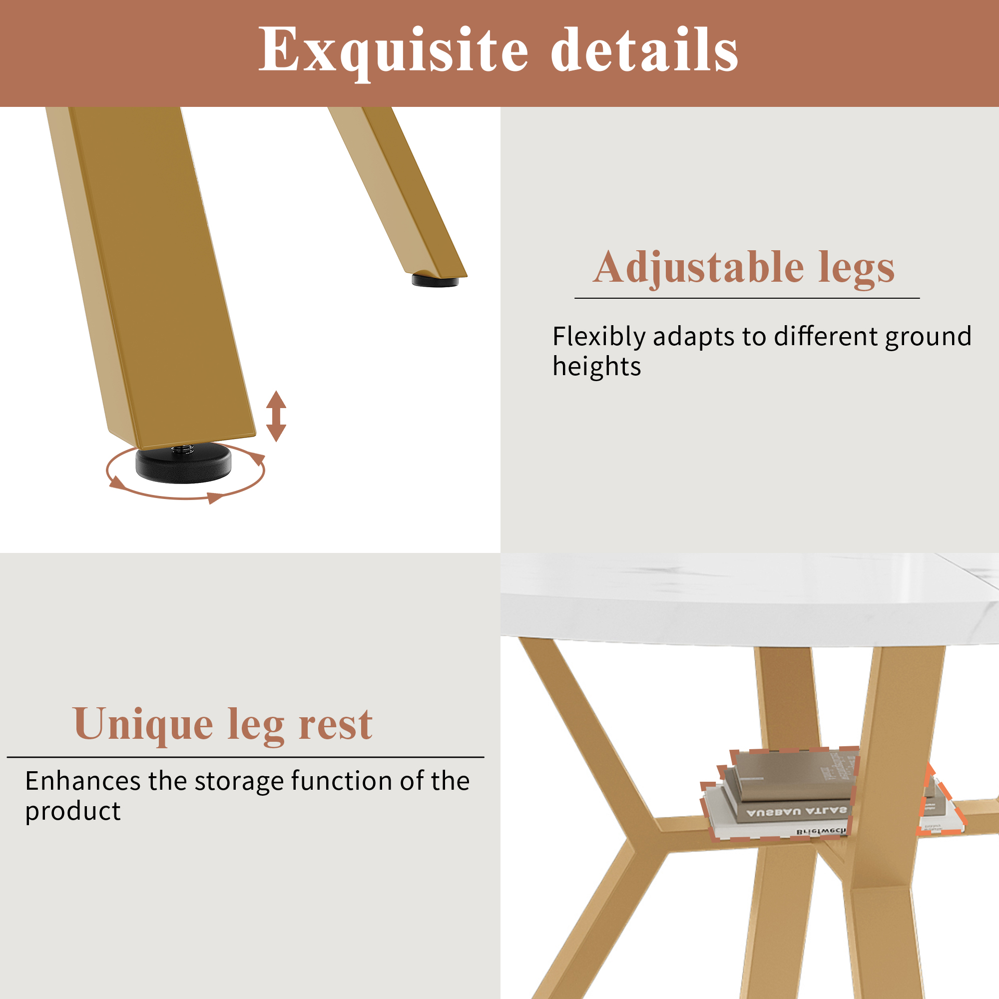 - Combo ItemProduct Name:Dining table set, dining table and chair set (5-piece), modern, simple round marble dining table and chair set, gold-coloured metal table legs + 4 ergonomic velvet chairs, green dining chairsMain Color:GreenMain Material:MDFProduct DimensionsAssembled Length (cm):Not ApplicableAssembled Width (cm):Not ApplicableAssembled Height (cm):Not ApplicableProduct Weight (kg):Not ApplicablePackage SizeSub-item 1: N639P264482GPackage Quantity: 1100.97 * 71.12 * 18.42 cm 14.8 kgSub-item 2: WF309294AAGPackage Quantity: 170.5 * 66 * 45 cm 21 kgProduct FeaturesModern, simple round table made of MDF material with marble structure veneer. The centrepiece of this dining table and chair combination is a round dining table with a table top made of MDF covered with a veneer with a fine marble structure. Displays a simple but elegant beauty. The MDF material is strong and durable, and the marble-textured veneer gives the desk top a richer texture and layering.Gold-coloured metal table legs for solid support and stylish decoration. The legs of the round table are made of metal and contrast with the marble structure of the table top, giving it a modern and stylish look. The metal table legs are designed to be stable and withstand heavy loads to ensure your safety and comfort while dining.Classic suede chair, ergonomic design. The matching four chairs are made of soft velvet, which is soft to the touch and comfortable. The design of the seat and backrest is absolutely ergonomic and can effectively support your back and waist, so you will not feel tired even when sitting for a long time. The chairs are not only beautiful and elegant, but also adds warmth and comfort to your home environment.The unique curved leg design emphasises beauty and stabilityThe legs of the chair have a unique curved shape that not only enhances the overall aesthetics, but also improves the stability of the chair. This design makes the chair more stable and durable and less prone to tipping over, providing added safety.Perfectly integrate into modern homes to enhance the quality of diningThe overall layout of this dining table and chair set is sleek and modern, which is very suitable for modern interior styles. MDF material and classic suede chairs together create a comfortable and elegant dining environment. Choosing this dining table and chair set will not only improve your dining quality, but also add a unique charm to your home.DescriptionsProduct DetailsProduct SizeTable top radius 50 cm, thickness 2.5 cm, height 75 cm; Bracket 65*65cm, tube width 5cmProduct Weight31.8KGMaterialMDFLoad-bearingTable:60KG, Chair:150KGContents of deliveryProducts and partsCountry of originChinaBeautiful and outstanding shape that forms the centrepiece of home artWith its elegant and unique shape, this dining table instantly becomes the artistic centrepiece of the living room. The table top has a rounded design with smooth and soft lines, and the white marble structure is like a delicate oil painting that brings a touch of elegance and serenity to the living environment. The golden, X-shaped metal console not only gives the table a secure hold, but also provides a strong contrast to its modern and minimalist design, emphasising fashion and taste. Choose this dining table to add a unique charm to your home.