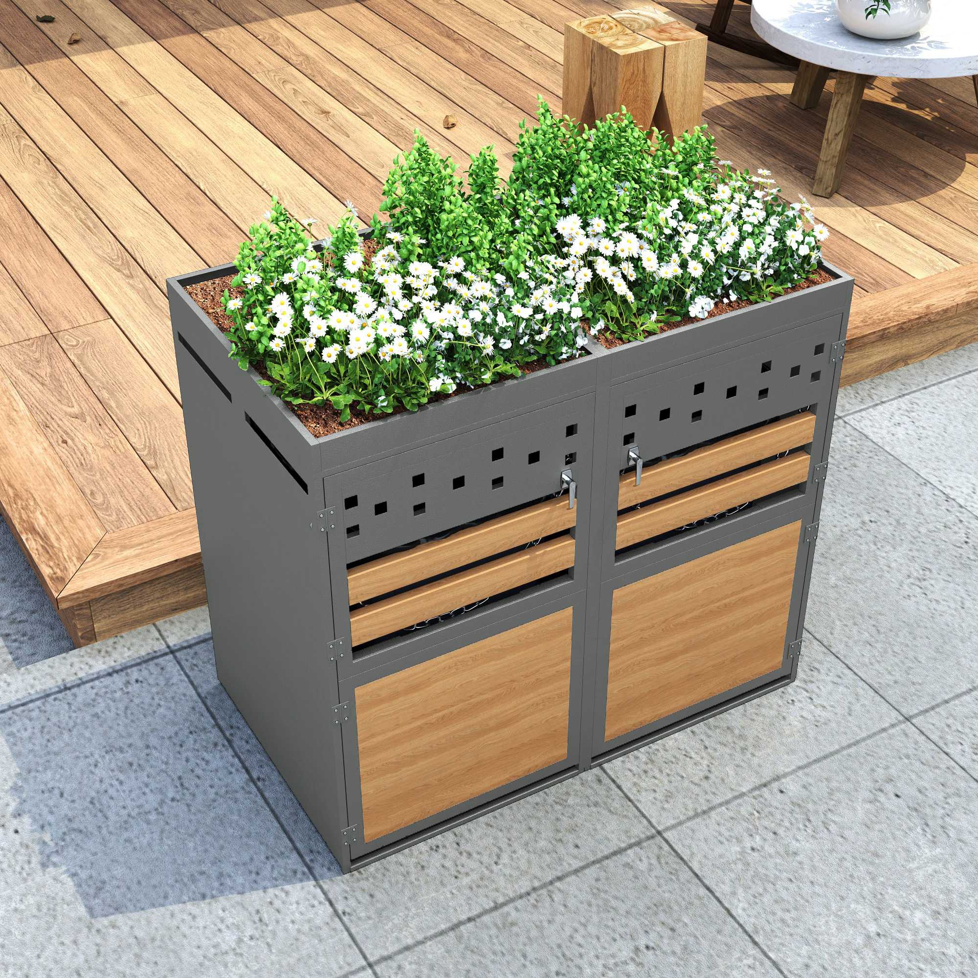 - Combo ItemProduct Name:Double bin storage box with green roof, 120-240 liter capacity, anthracite, wood-look door, including extension option, storage box for bins, bin storageMain Color:Grey,WoodMain Material:SteelProduct DimensionsAssembled Length (cm):132.00Assembled Width (cm):80.00Assembled Height (cm):125.00Product Weight (kg):41.50Package SizeSub-item 1: N130P409110BPackage Quantity: 1118 * 58 * 15 cm 21 kgSub-item 2: N130P409109BPackage Quantity: 1118.5 * 58 * 20 cm 29.3 kgProduct FeaturesModern Design: This bin and storage box set includes two bins. This set accommodates up to two 120-240 liter bins and enhances the look of your driveway with its attractive design. The top of the bin can be planted with greenery, making it a real eye-catcher in your home.High Quality: The bins are made of high-quality galvanized steel, which is robust and durable. The slots in the door ensure good ventilation and a timeless design. The box conceals and protects your bins, creating a clean and attractive environment.Practical and Secure: The front door of the box features a handle with a key, making it easy to open and close. You can securely lock and protect the contents of the box. It also comes with two chains, allowing you to easily tip the bins over and dispose of the waste.Planting Top: Planting ground cover, herbs, or small shrubs on top of the bins provides a perfect planting area. The drainage holes on the back allow rainwater to run off more easily, preventing overflow. This prevents waterlogging and ensures your plants stay healthy for longer.Durable: The galvanized sheet metal of the product is waterproof and sun-resistant. Furthermore, the mounting screws are also made of stainless steel to ensure long-term use and prevent rust.