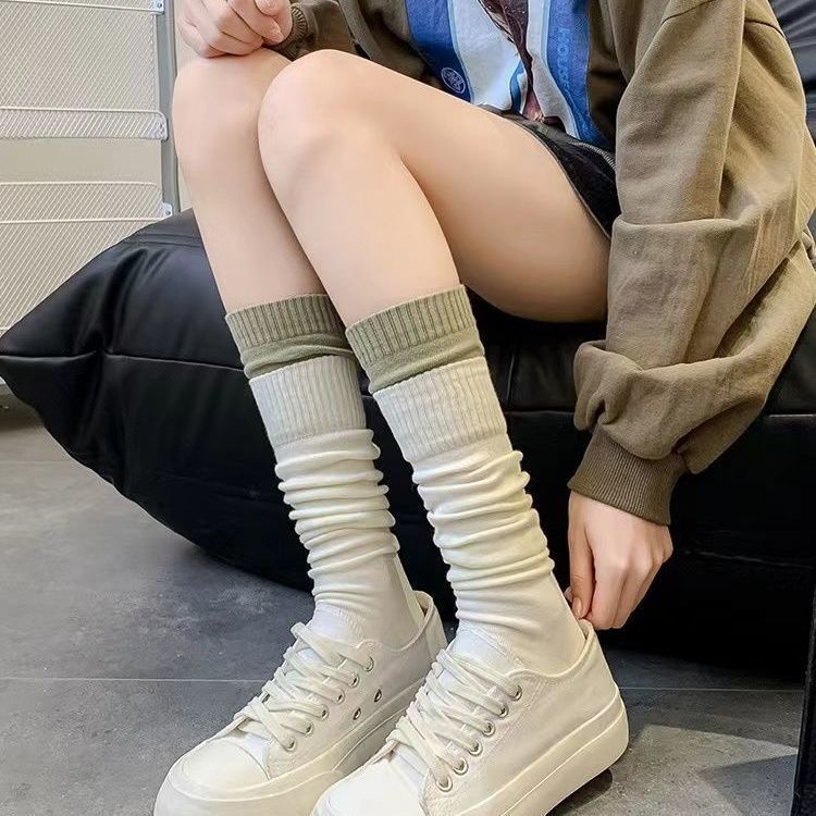 Dual Rib Top Color-blocked Calf Socks For Spring And Autumn, Trendy Ins-style Outerwear Women’s Socks, Popular Korean Street Fashion Slouch Socks
