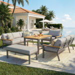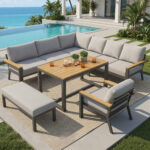 Eight-person L-shaped Garden Sofa Set With Wooden Table Weatherproof Corner Suite Made Of Iron Including Armchair, Bench & Wooden Worktop With Grey Cushions