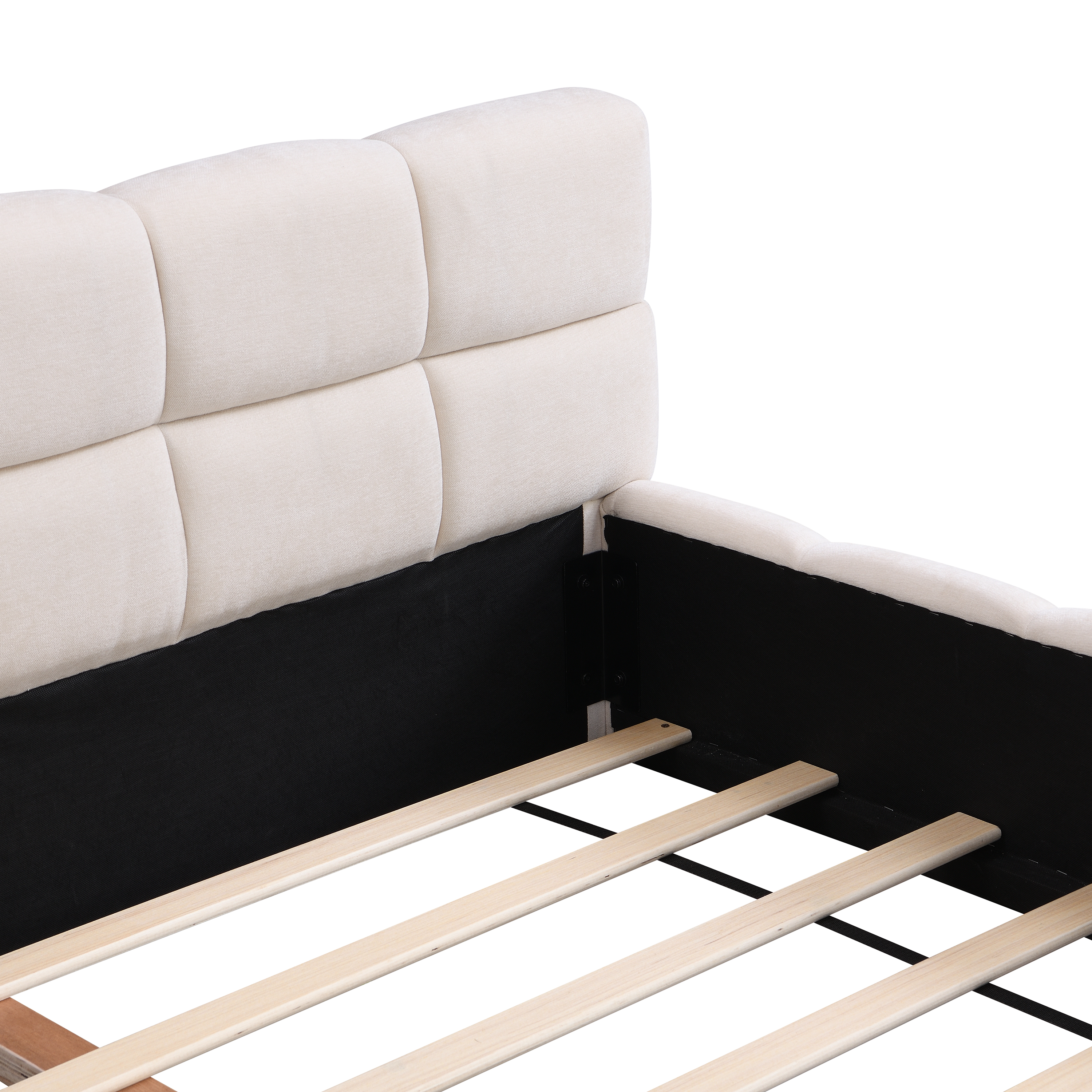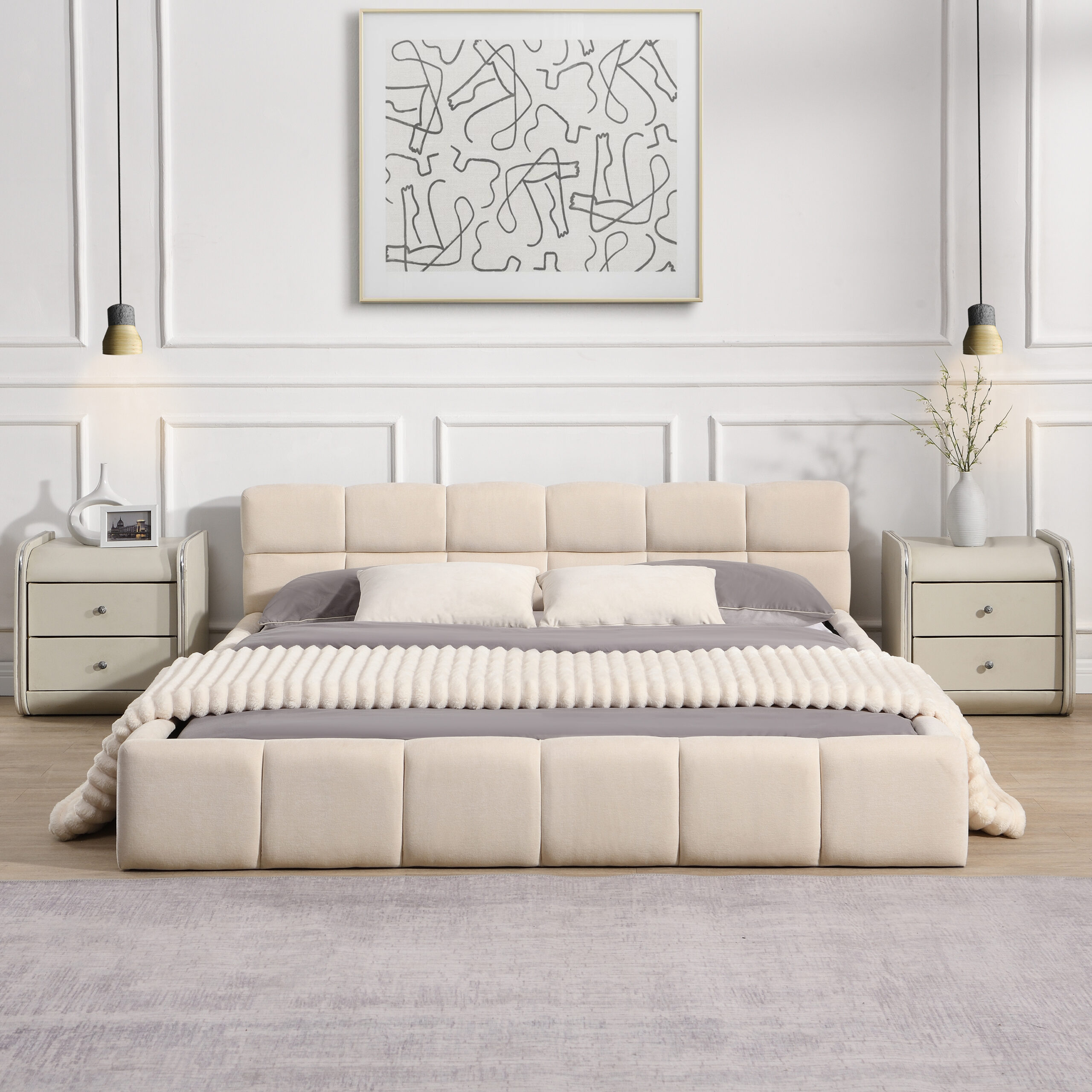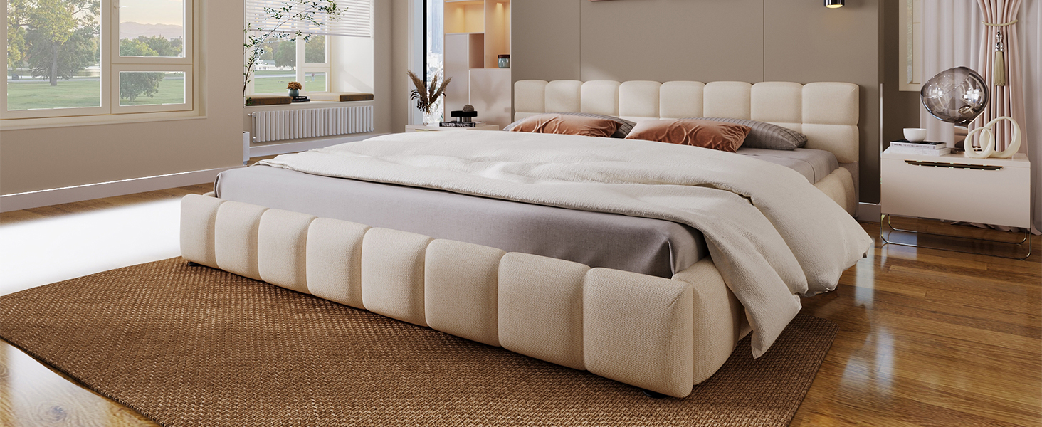Combo ItemProduct Name:Elegant Beige Chenille Upholstered Bed with Checkerboard Design, Queen, BeigeMain Color:BeigeMain Material:ChenilleBed Size:QueenBed Type:Bed FrameUpholstery Material:ChenilleProduct DimensionsAssembled Length (in.):88.19Assembled Width (in.):67.32Assembled Height (in.):24.00Product Weight (lbs.):81.79Package SizeSub-item 1: N769P264804APackage Quantity: 183 * 11.8 * 7.75 in. 37.26 lbs.Sub-item 2: N769P264803APackage Quantity: 168.9 * 19.69 * 8.46 in. 59.52 lbs.Product FeaturesThis stunning soft upholstered bed is made from high-quality chenille fabric, offering a plush and velvety texture that ensures ultimate comfort and sophistication.The bed features a stylish checkerboard pattern on the headboard, adding a modern and timeless aesthetic to your bedroom decor.The soft beige color of the bed creates a warm and inviting atmosphere, making it a versatile piece that complements a variety of interior styles.Designed to meet different needs, this bed comes in both Queen and King sizes, providing options for spacious or cozy sleeping arrangements.Combining softness with durability, this bed offers a perfect balance of comfort and support, ensuring a restful night’s sleep.