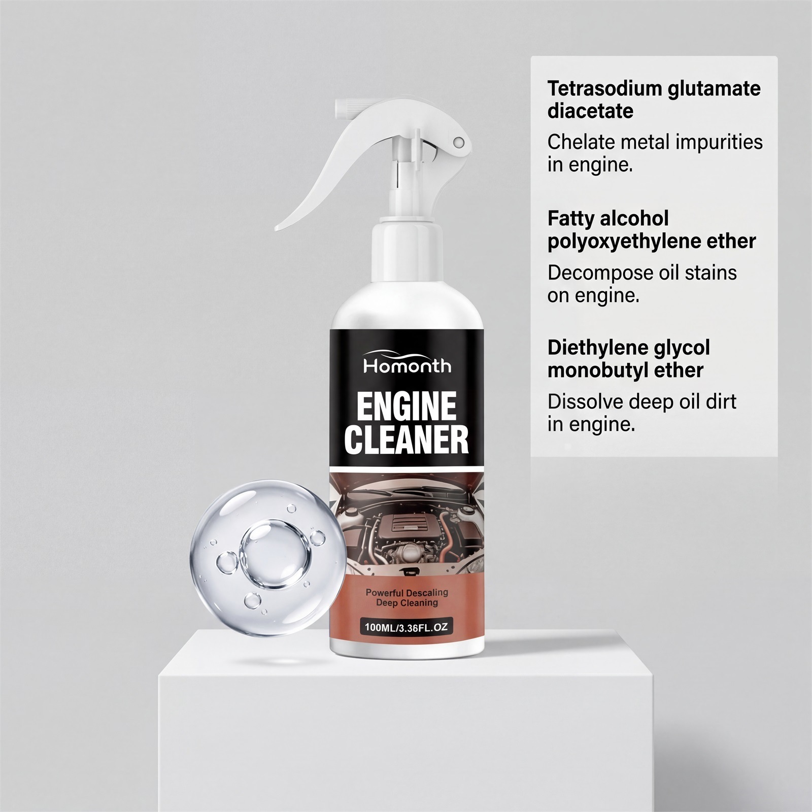 Water, fatty alcohol polyoxyethylene ether, diethylene glycol butyl ether, tetrasodium glutamate diacetate, 1,2- hexanediol, hydroxyethylidene diphosphate.