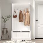 Entryway Bench With Standing Coat Rack, Hall Tree With Shoe Storage Bench, Entryway Organizer With 5 Hooks, White