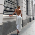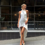 • Halter Neck with Open Back, Asymmetrical Hem, Satin Finish