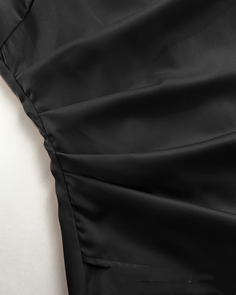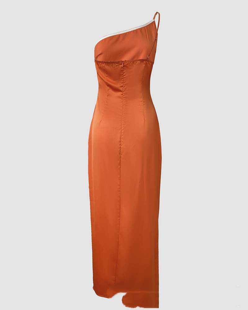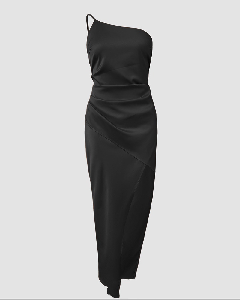 European And American-style Solid-color One-shoulder Pleated Slit Dress
