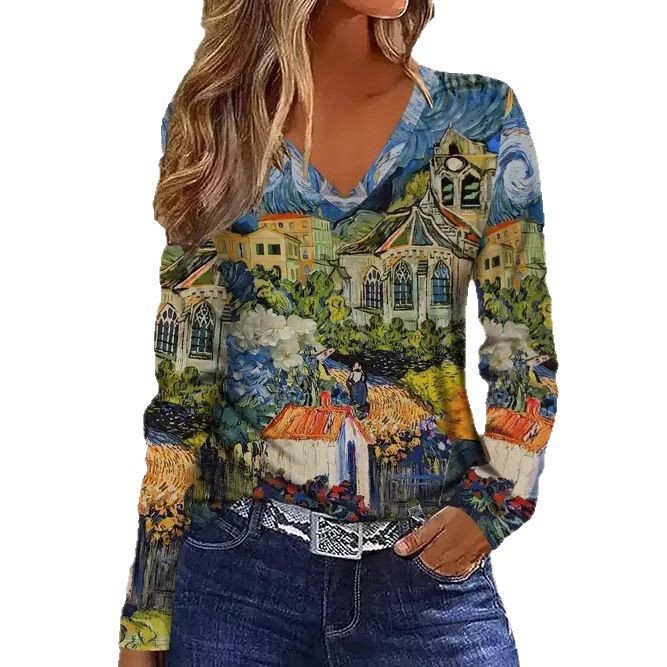 Fashionable Casual Geometric V-Neck Long-Sleeve Top For Women