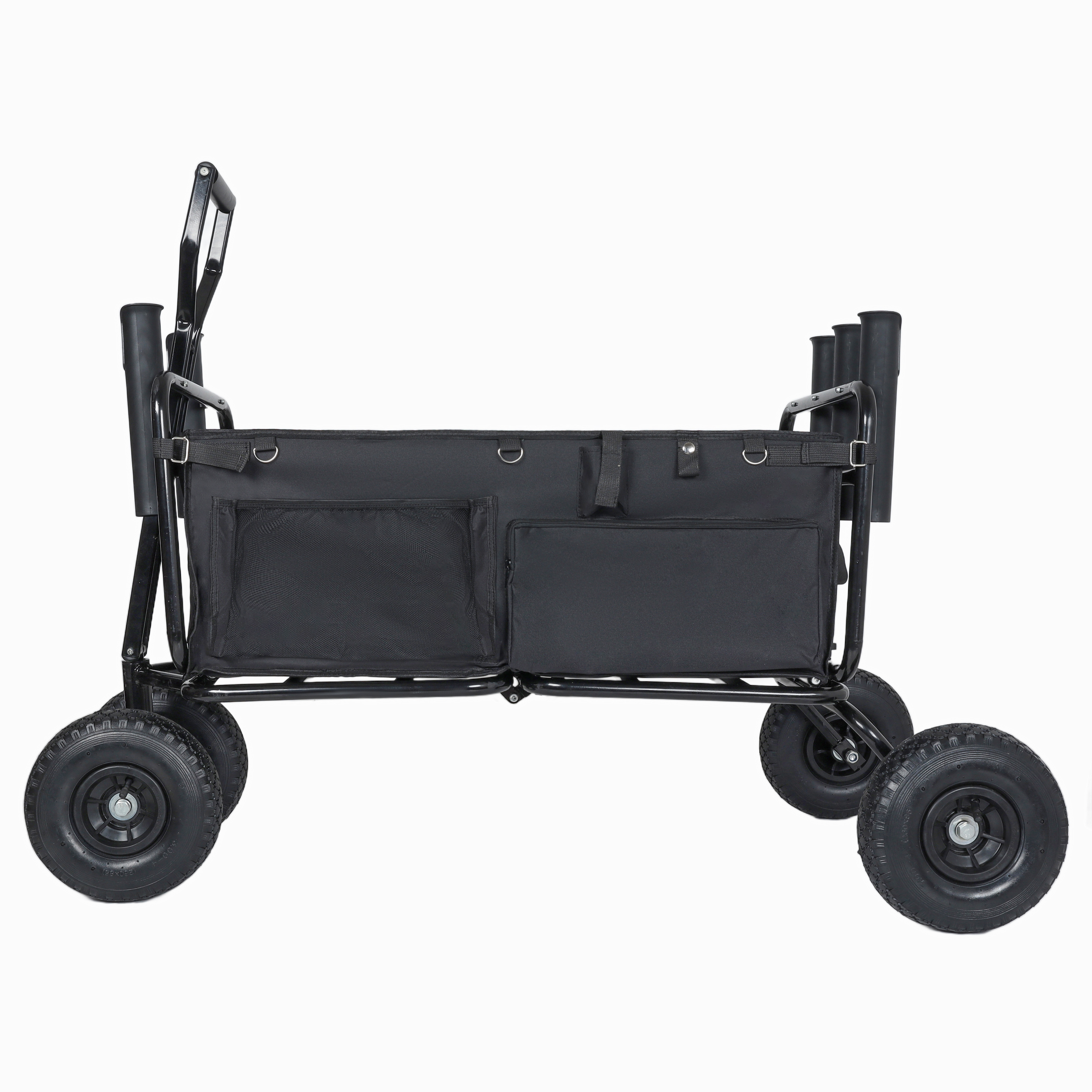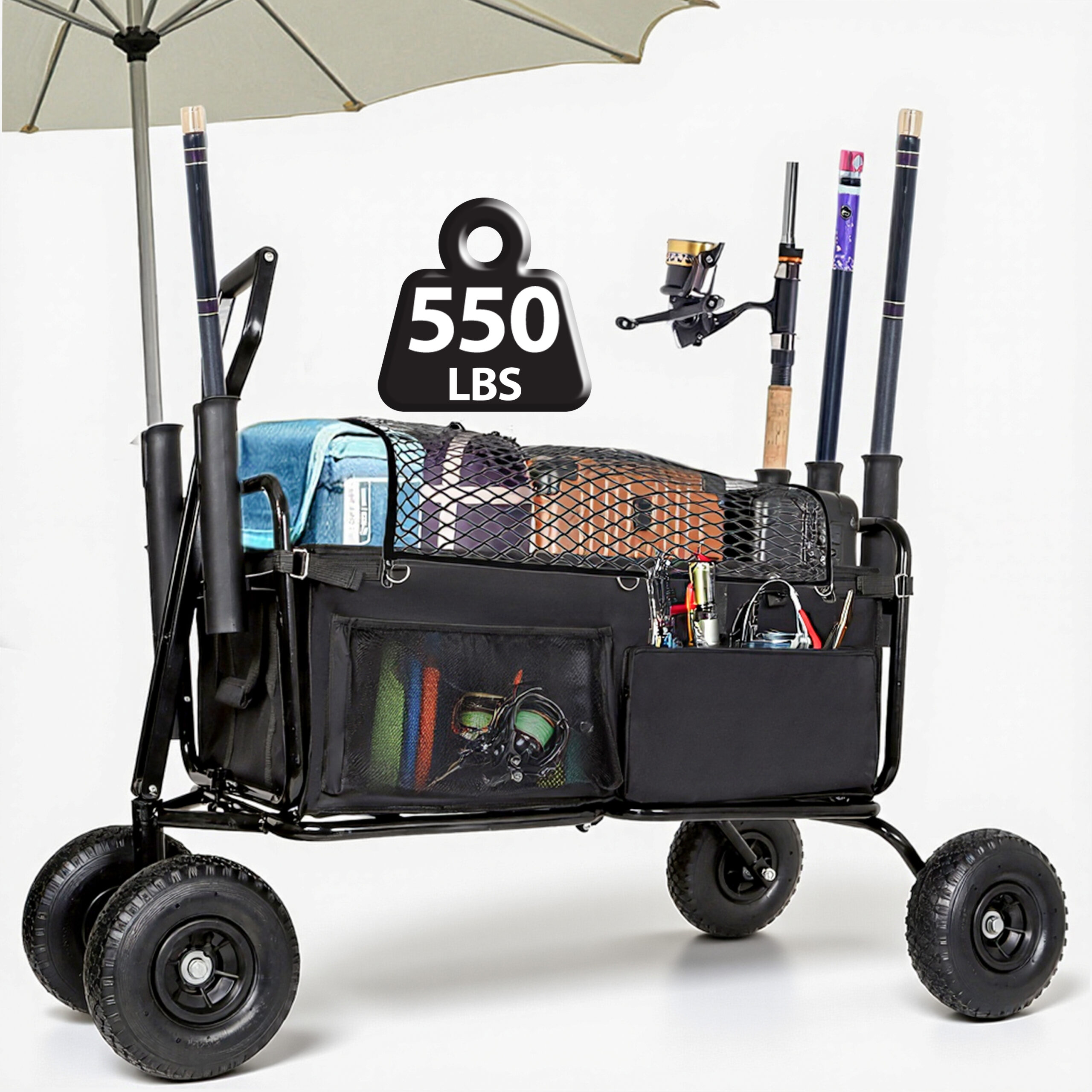 Fishing Cart Beach Cart Collapsible Wagon 9.85 All- Terrain Wheels For Sand Heavy Duty Garden Cart With Rod Holders Umbrella Holder And Storage Pockets 550lb Large Capacity Black