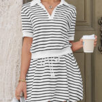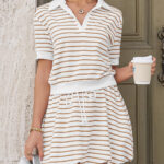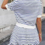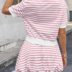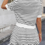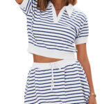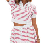 Fisoew Womens Striped 2 Piece Outfits Skort Set Short Sleeves Shirts Bubble Mini Skirt Sets Matching Sets
