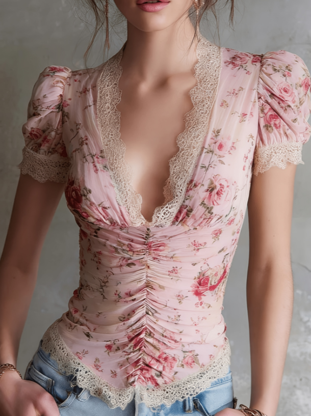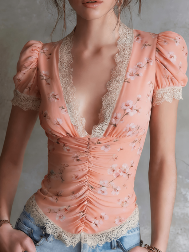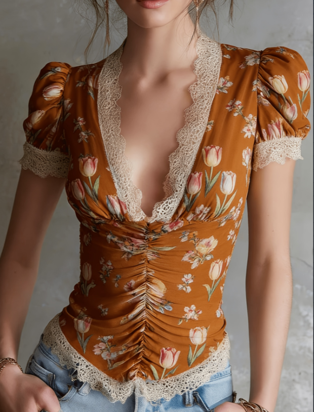 French Retro Style Lace Patchwork Printed Puff Sleeve Top For Women