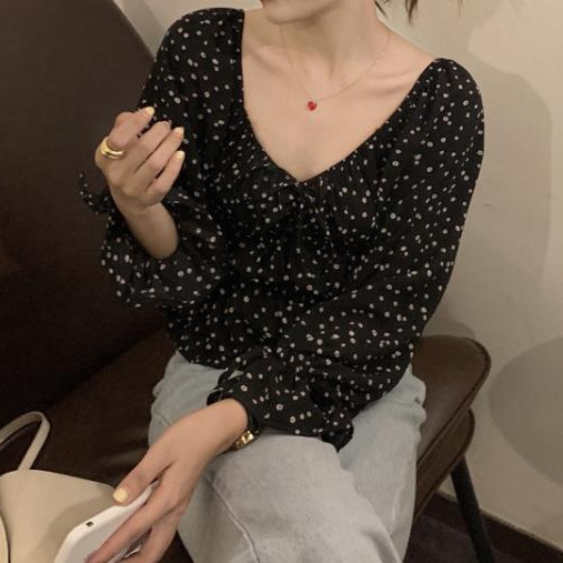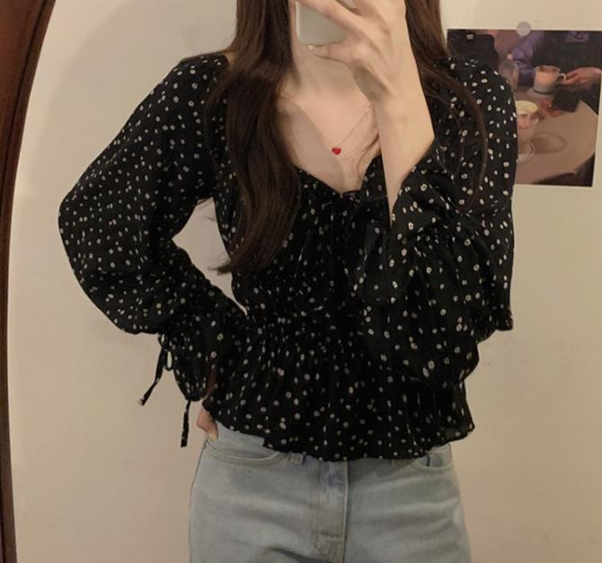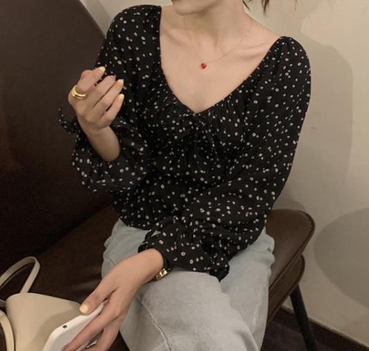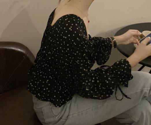 French-style Off-shoulder Square-neck Puffed-sleeve Black Floral Chiffon Blouse is designed for style, comfort, and everyday use.