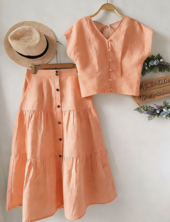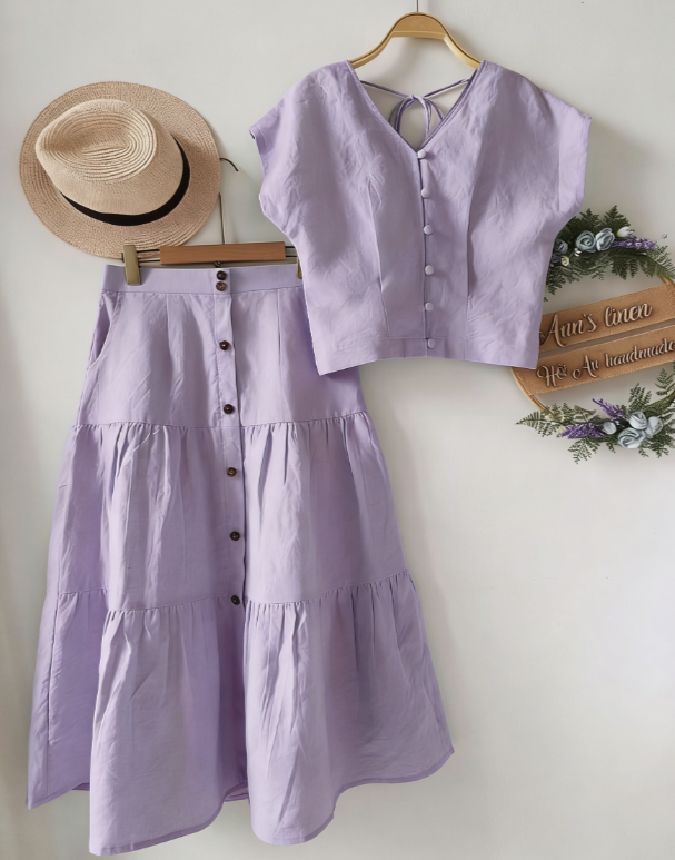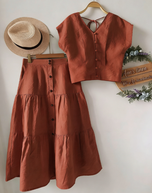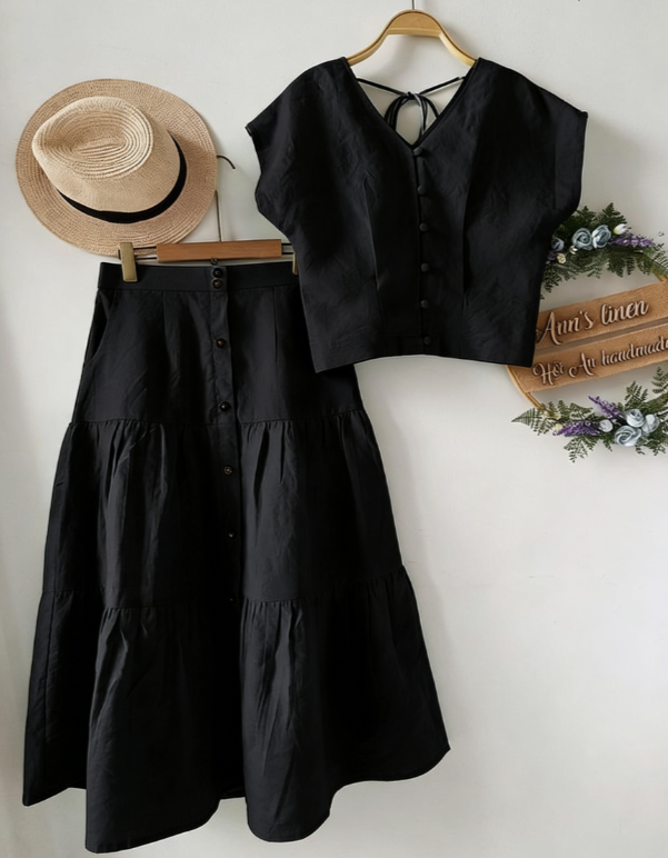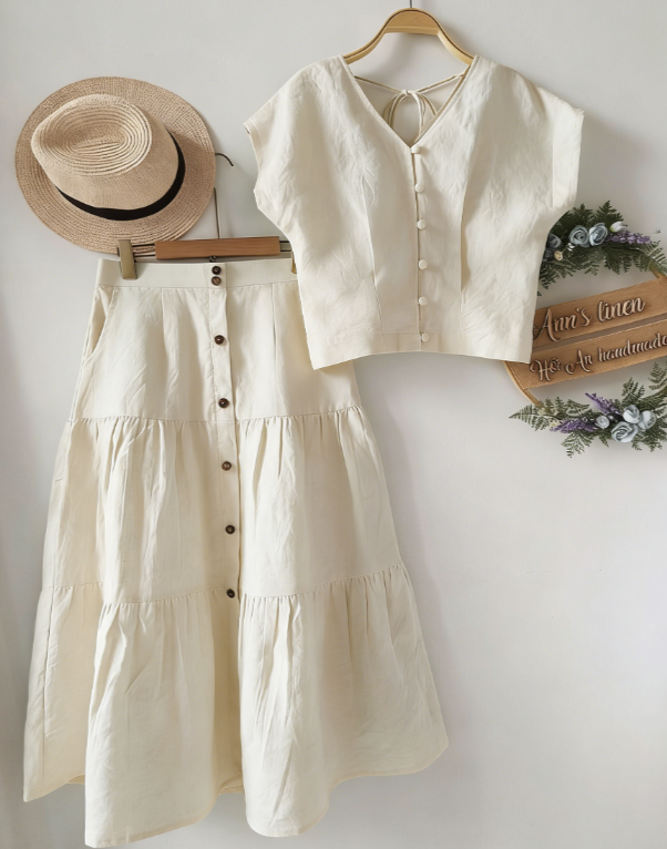 • V-neck button-down short top, high-waisted flared maxi skirt, back tie design, simple, fresh and gentle