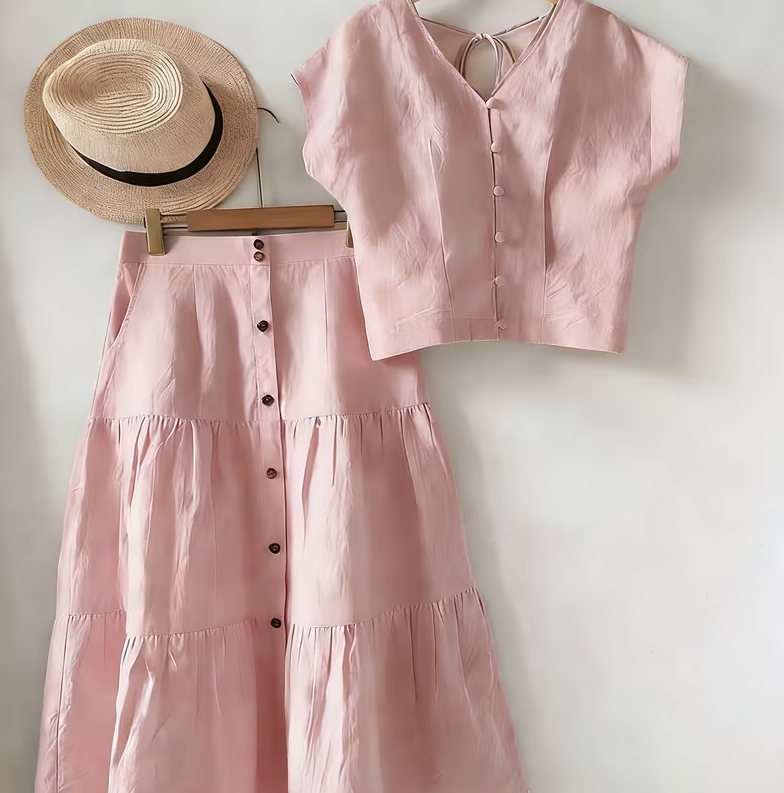 Gentle Style V-neck Button-down Sleeveless Top And High-waisted Skirt Set For Women is designed for style, comfort, and everyday wear.