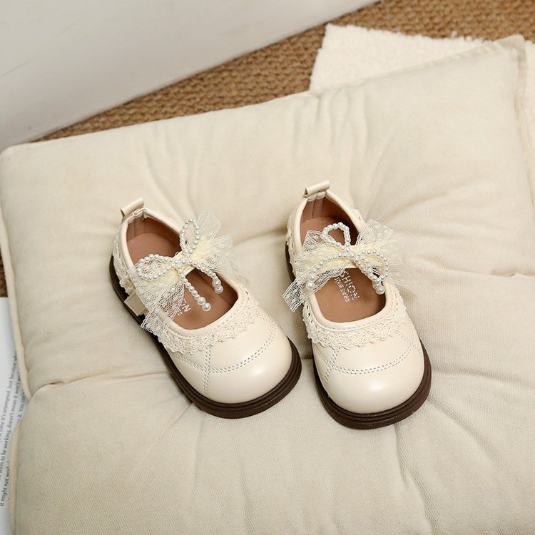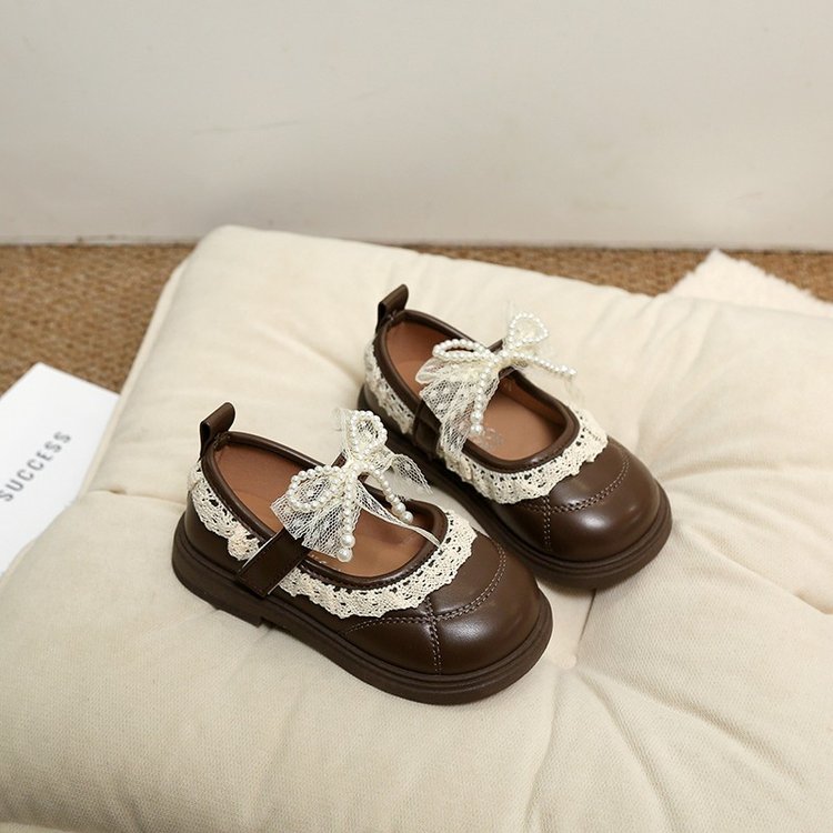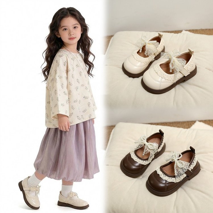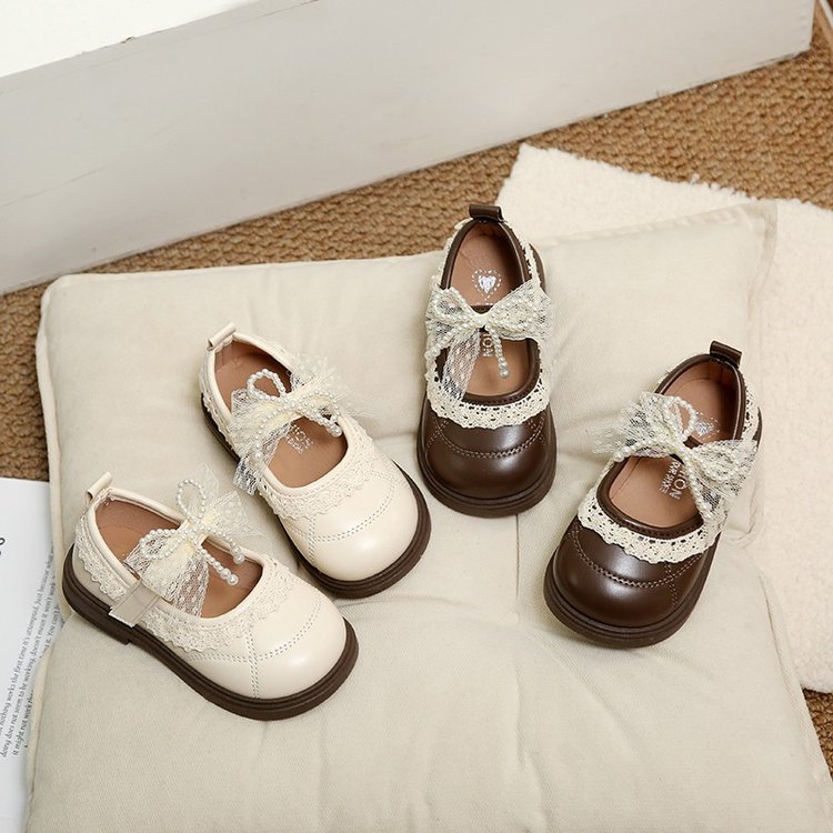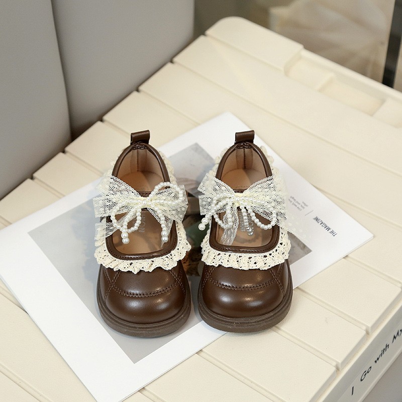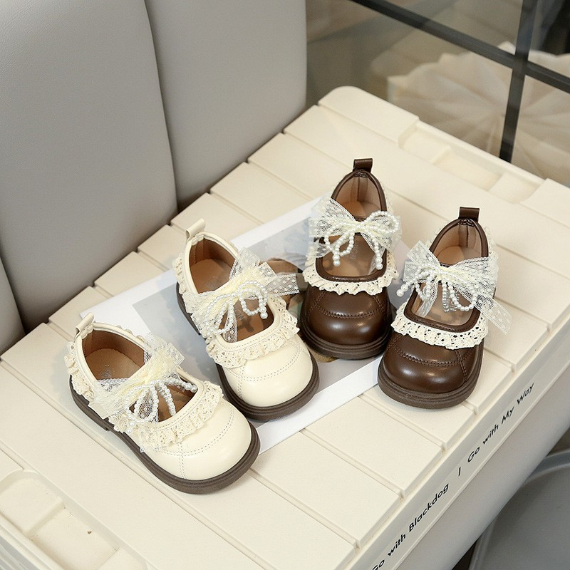 Round toe, scalloped lace trim, pearl tulle bow decor, adjustable mary jane strap, thick chunky anti-slip sole, stitched toe cap,glossy faux leather, classic cream beige / retro dark brown,vintage cottagecore, british preppy, gentle retro girly aesthetic,school daily wear, birthday party, wedding flower girl, photoshoot, autumn/spring outing, formal events,toddler girls, little kids, infant children