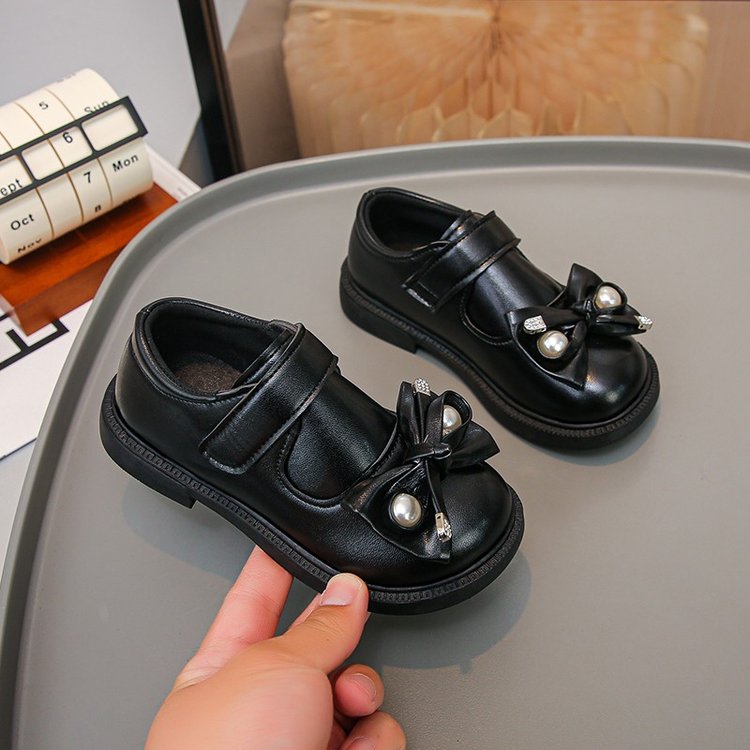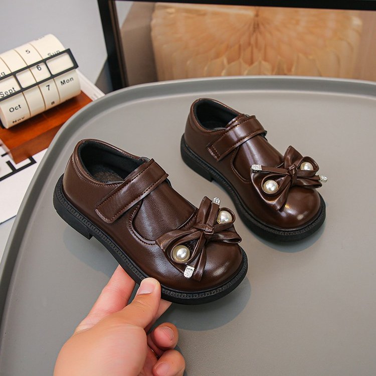 Round toe, smooth faux leather upper, pearl & rhinestone bow decor, wide magic strap closure, chunky anti-slip low heel sole,Classic solid color, glossy leather finish, black / retro dark brown,British preppy, vintage academia, elegant sweet schoolgirl style,School uniform matching, daily commute, performance, birthday party, formal ceremony, all seasons,Toddler girls, little kids, young girls