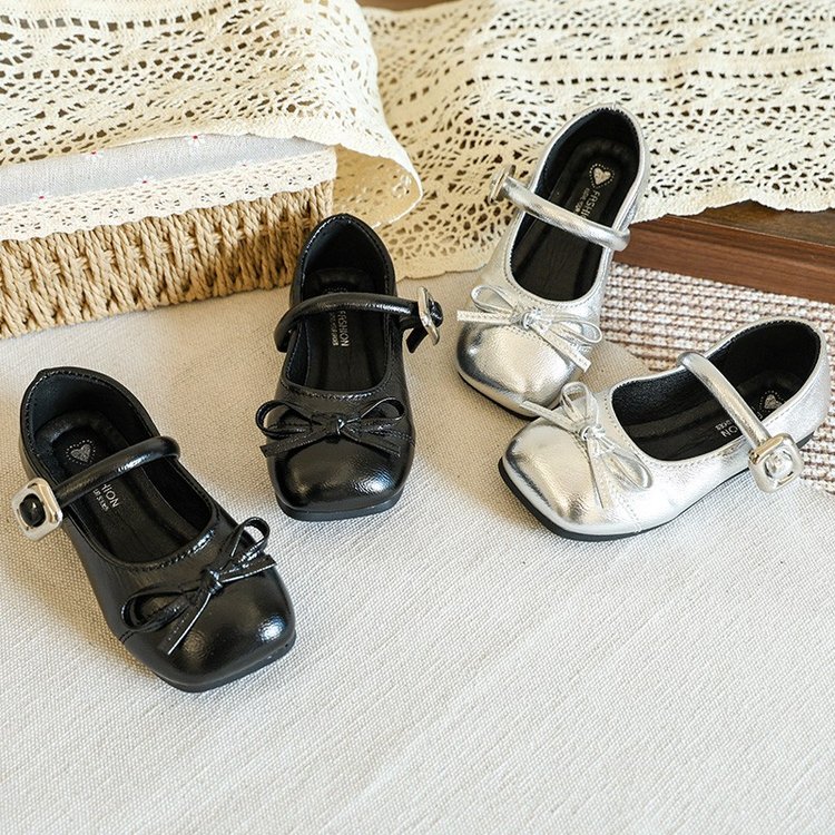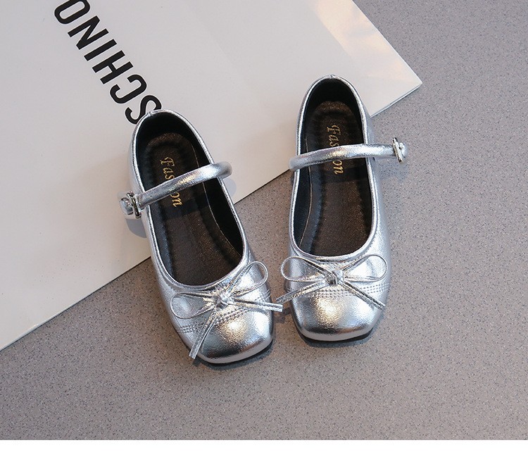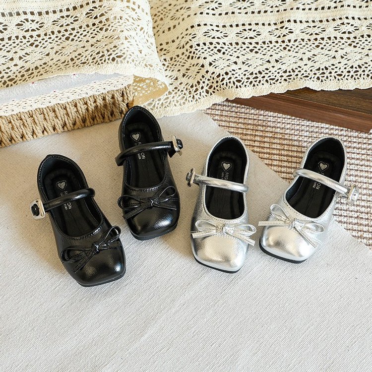 Mini square toe, single mary jane strap, decorative metal buckle, front small bow accent, slip-on flat design,shiny metallic silver / classic black faux leather, smooth glossy finish,minimalist elegant, simple chic, versatile all-match,school uniform, daily casual, wedding party, flower girl, birthday performance, formal occasion,toddler girls, little kids, young girls