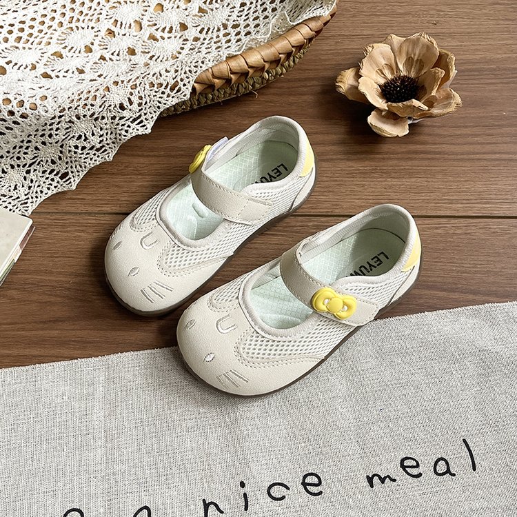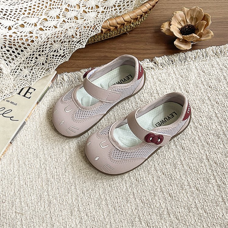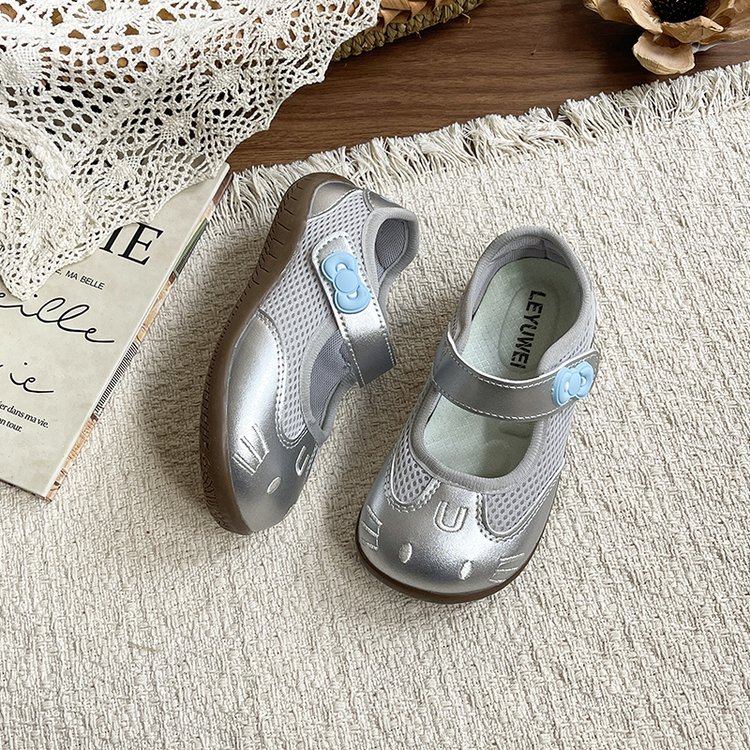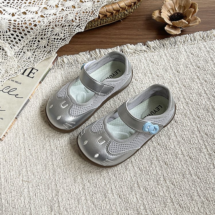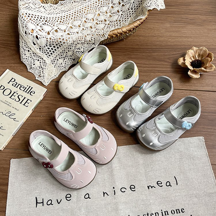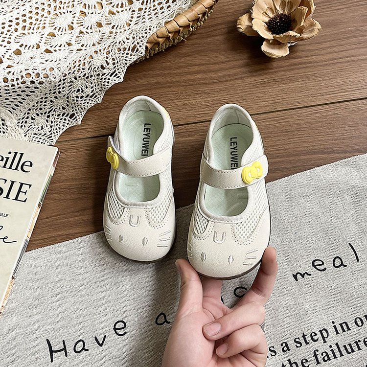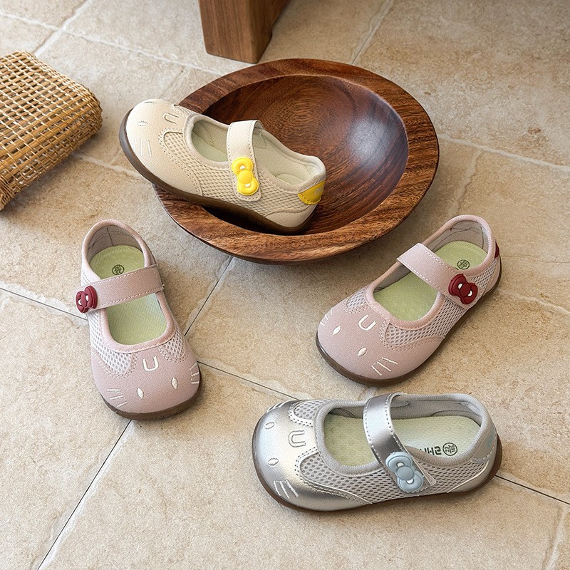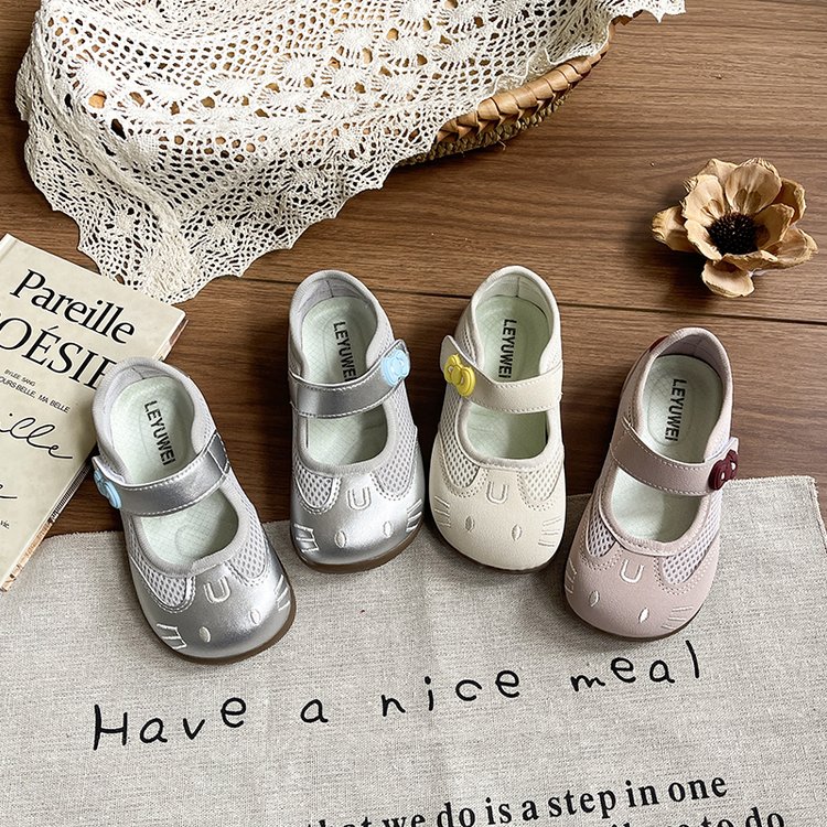 Round toe, cute cat face cartoon embroidery, breathable mesh upper, single mary jane strap, decorative flower buckle, soft flexible non-slip sole,Air mesh fabric, cream white / blush pink / metallic silver,Sweet kawaii, fresh cute, casual all-match girly style,Spring & summer daily wear, indoor home wear, outdoor walking, toddler learning to walk, park outing,Infant babies, toddler girls, early walkers