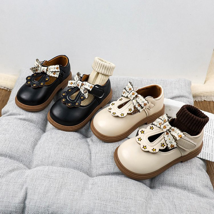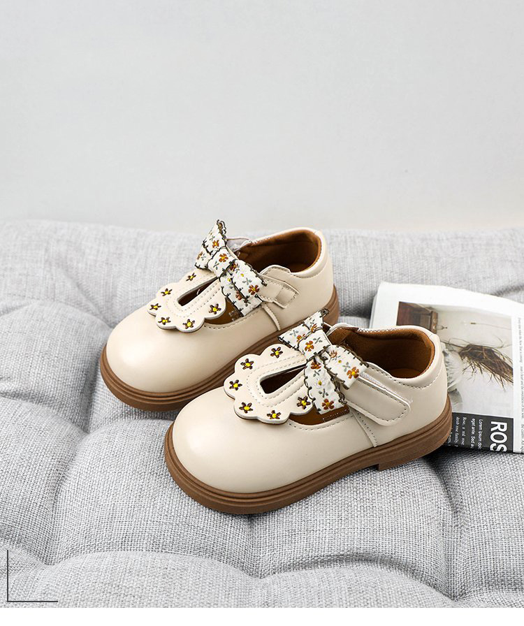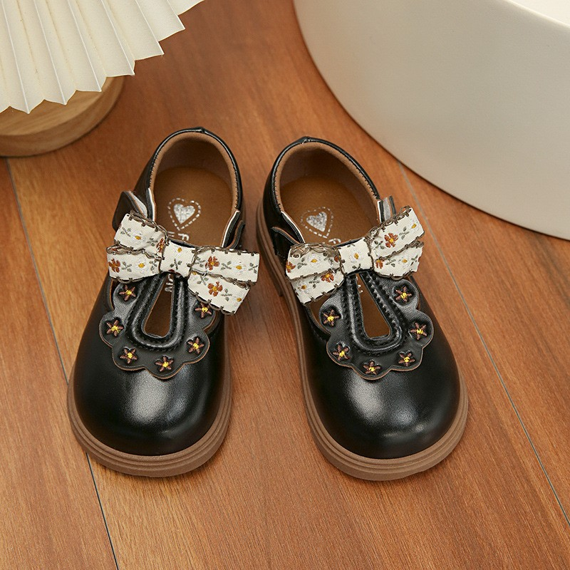 • T-strap cutout, scalloped wave edge, floral print bow detail, adjustable hook & loop strap, round toe,smooth faux leather, classic black / beige, contrast brown trim,cottagecore preppy, sweet retro, school daily wear, birthday party, photo shoot, spring/autumn outing,toddler girls, little kids, infant children