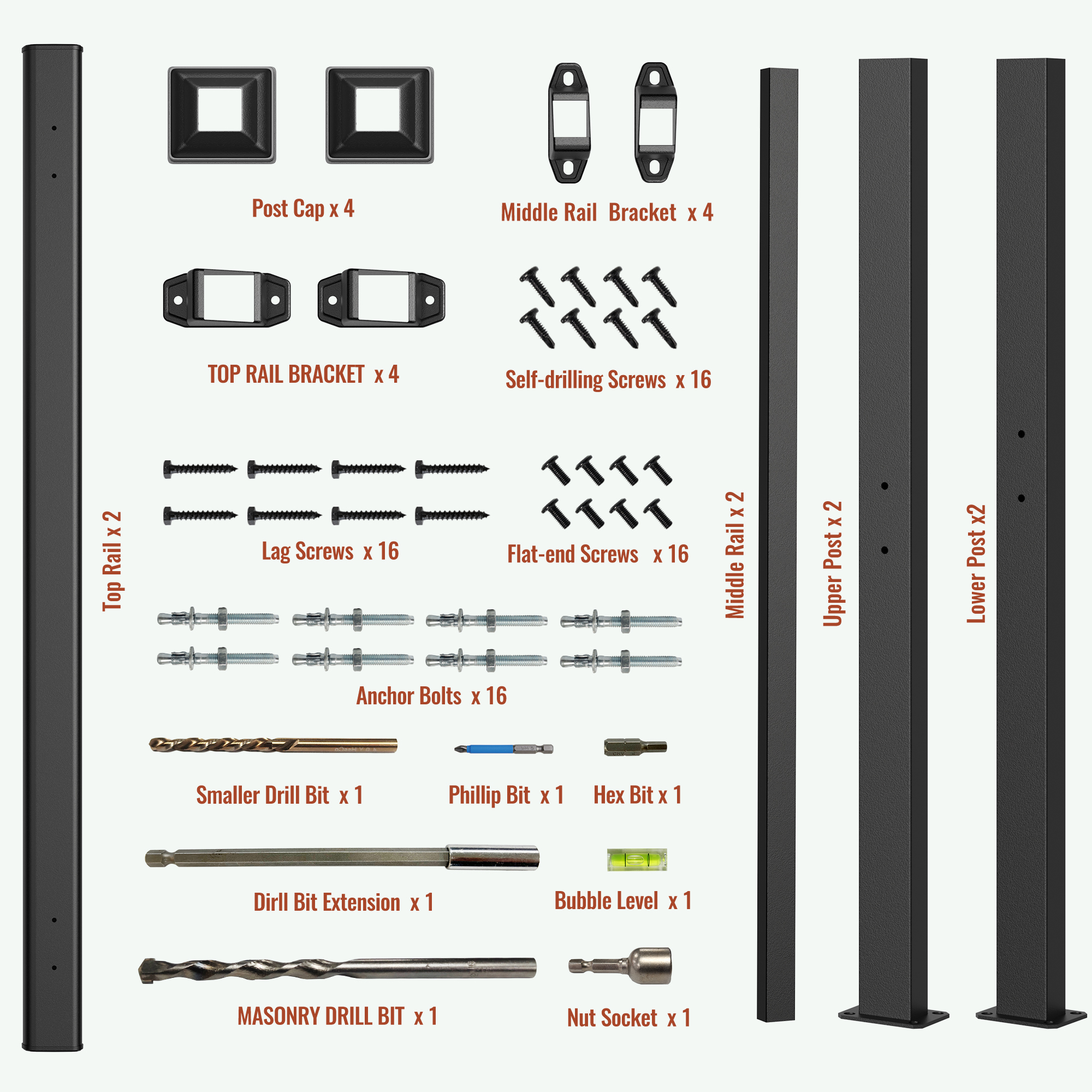 • Single Box ProductProduct Name:Hand Rails for Outdoor Steps, 1-2 Step Handrail 2 PackMain Color:BlackMain Material:Carbon steelProduct DimensionsAssembled Length (in.):36.00Assembled Width (in.):26.50Assembled Height (in.):12.00Product Weight (lbs.):20.00Package SizeLength (in.):37.99Width (in.):7.68Height (in.):7.48Weight (lbs.):24.25