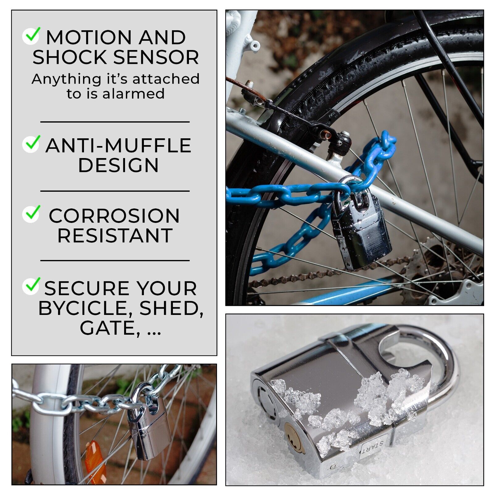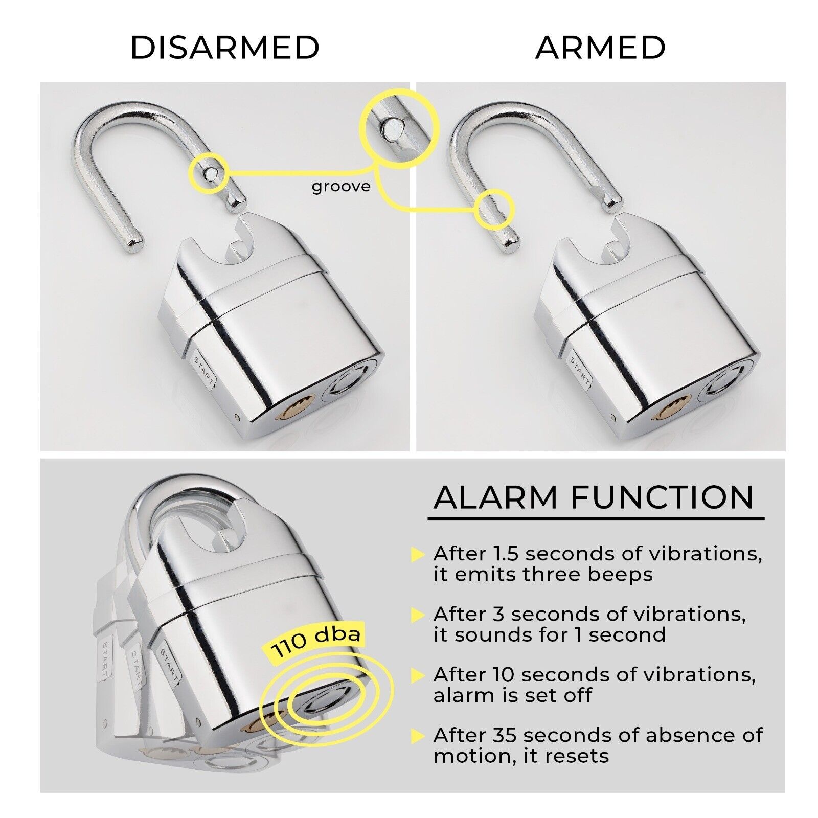 • The lock has a 110db alarm which makes it exceptionally loud and works as a strong preventive against theft and signals anyone close to the possible security breach