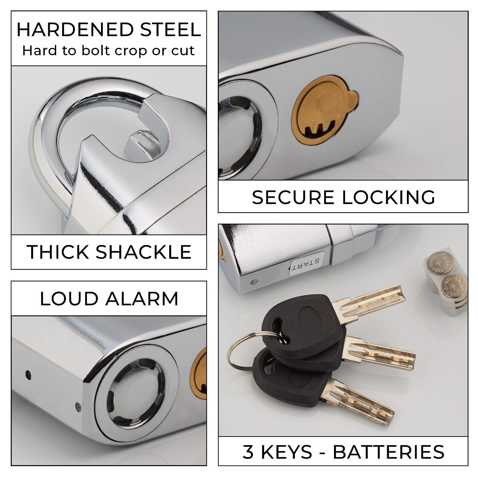 • Our Heavy Duty automatic 3 tone silver alarm padlock with hardened zinc alloy body and shackle diameter of 10mm provides an outstanding resistance to tampering which makes it much difficult to alter the padlock and protects your valuable items