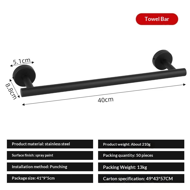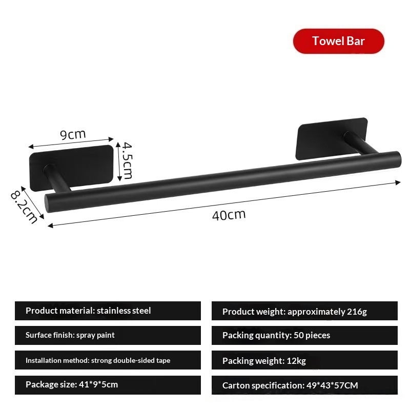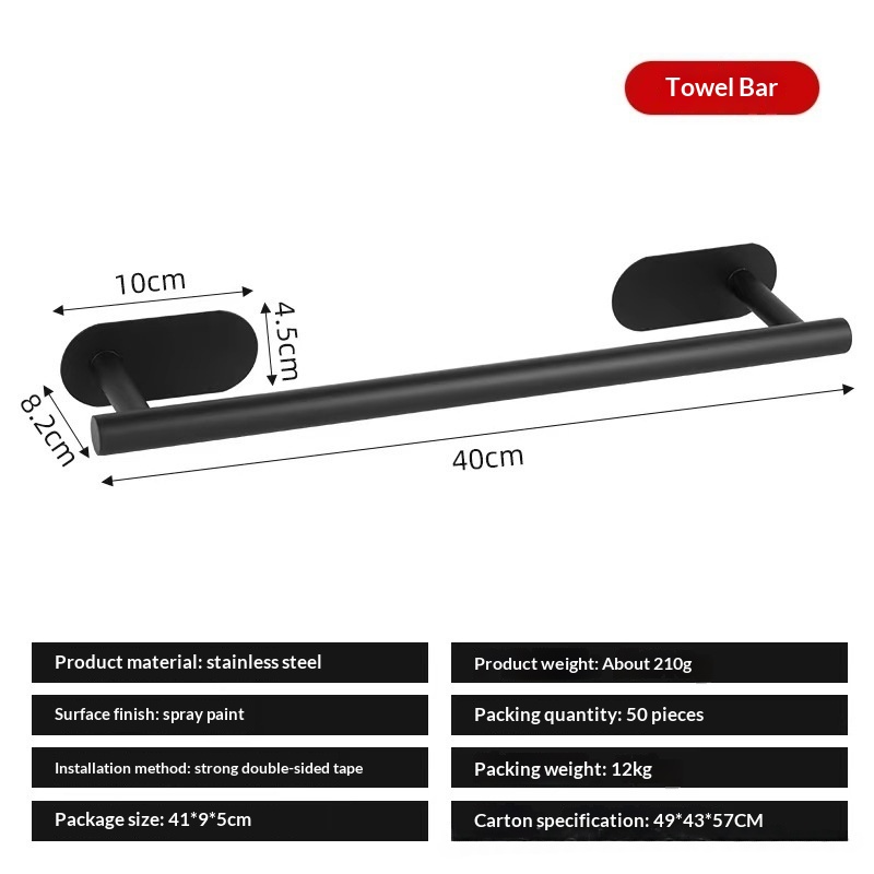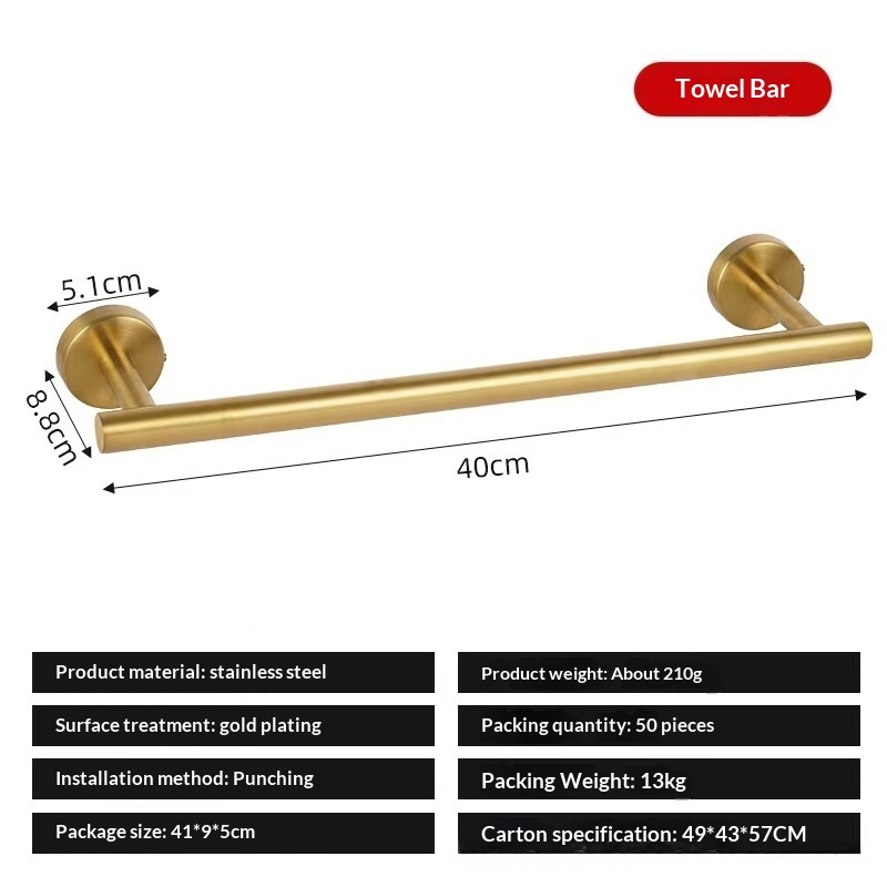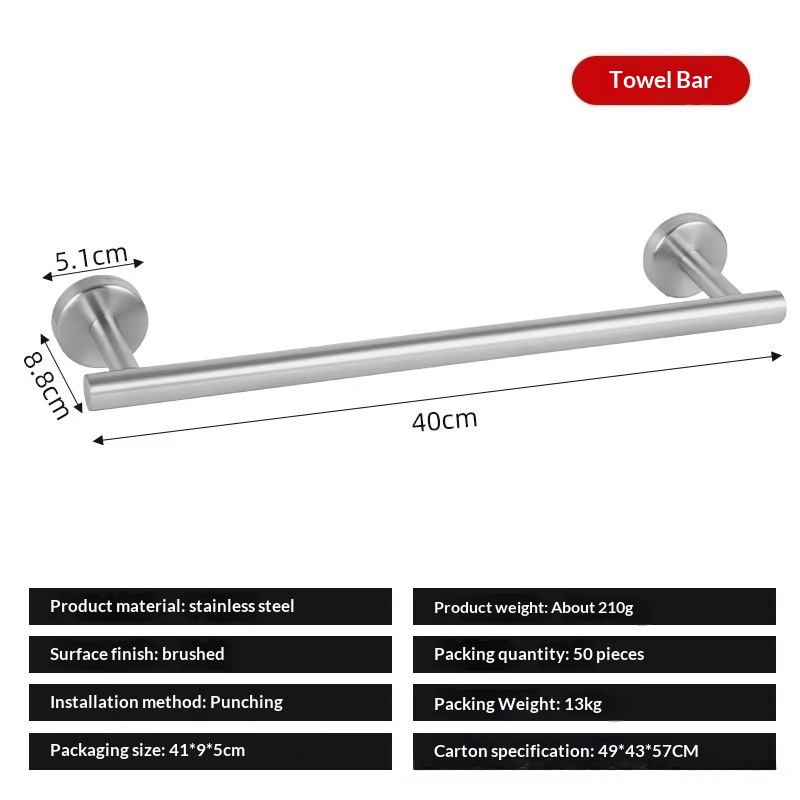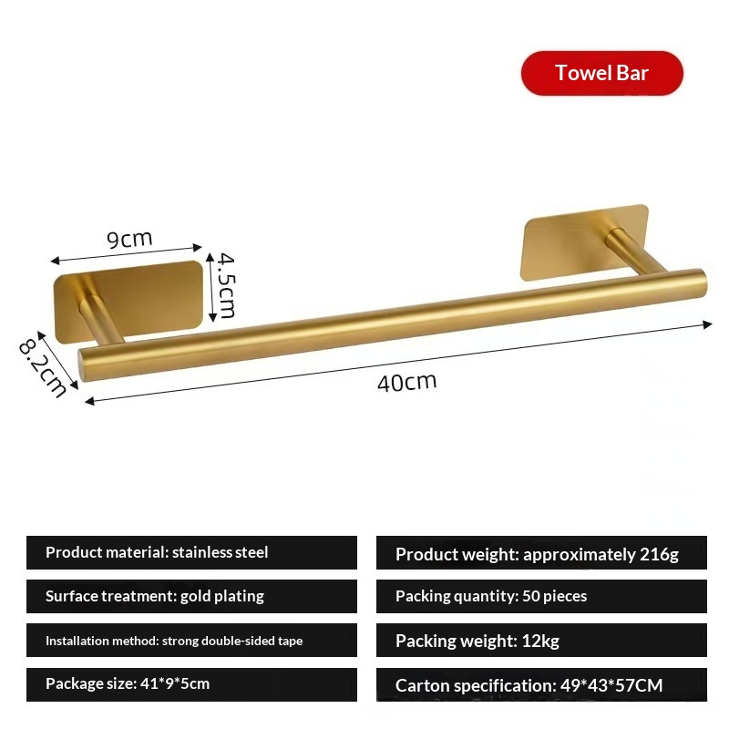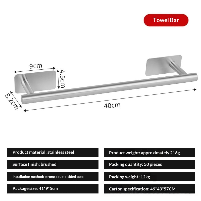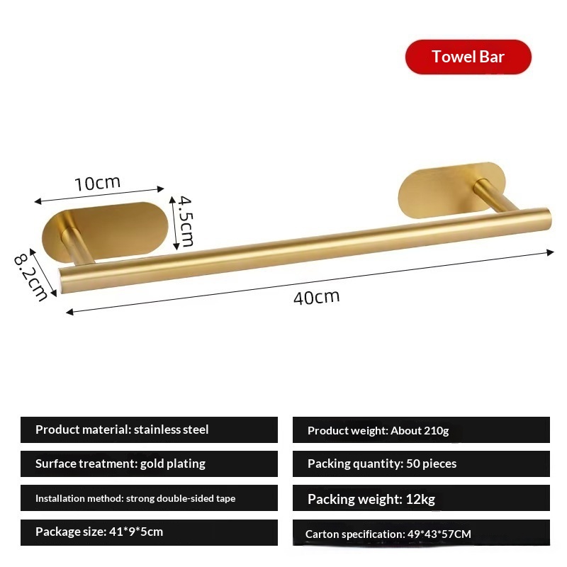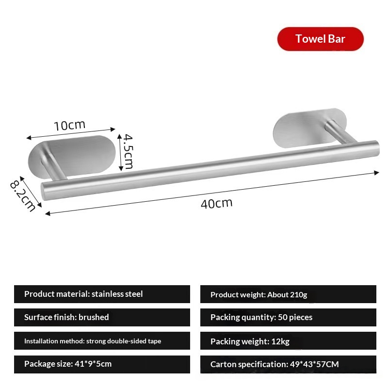 This stainless steel towel bar features a light luxury design and offers both drilled and drill-free installation options, making it suitable for bathrooms and various home settings while combining aesthetic appeal with practical storage and organization functionality. • 5 kg • 1 x Towel Bar
