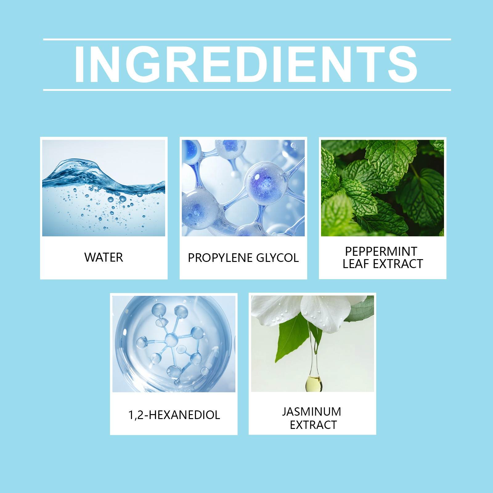 Water, propylene glycl, mint leaf extract, 1,2- hexanediol, jasmine extract.