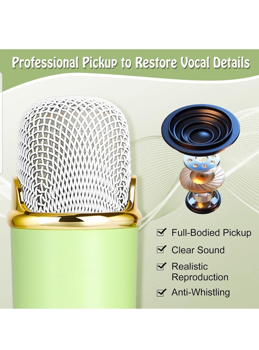 • The wireless microphone has a built-in 10W speaker designed to produce sound optimised for high performance. The wireless microphone has 6 magical voice effects including Acoustic, Karaoke, Monster, Female, Male, Baby, perfect for duets and dancing. Its advanced active noise cancellation technology and professional DSP audio processor ensure that every word you sing sounds perfect.