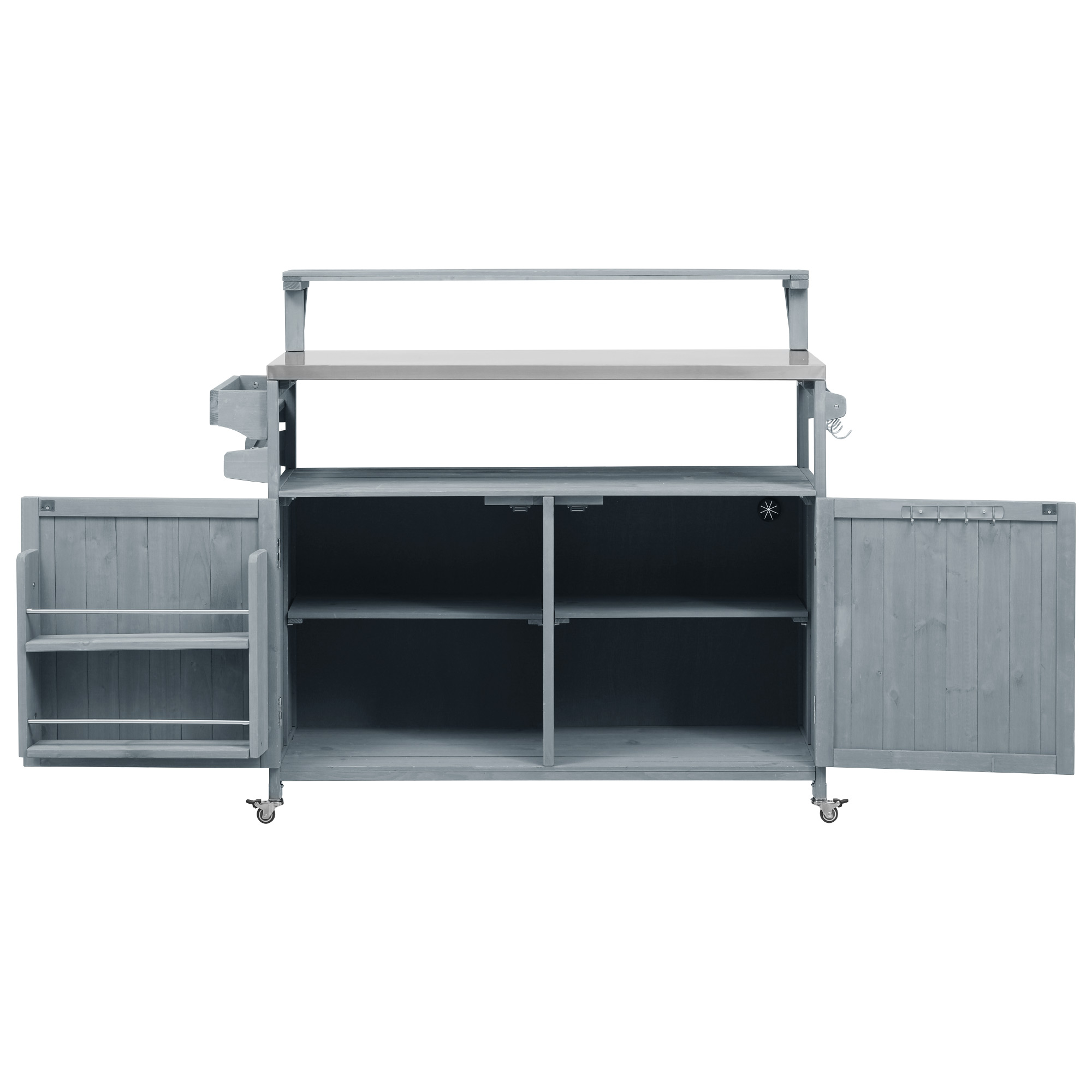 K&K 53.3 Outdoor Kitchen Island With Raised Shelf, Solid Wood Storage Cabinet With Stainless Steel Top, Outdoor Rolling Grill Cart With Internal Storage Rack, Adjustable Shelf, Spice Rack, Grey Blue