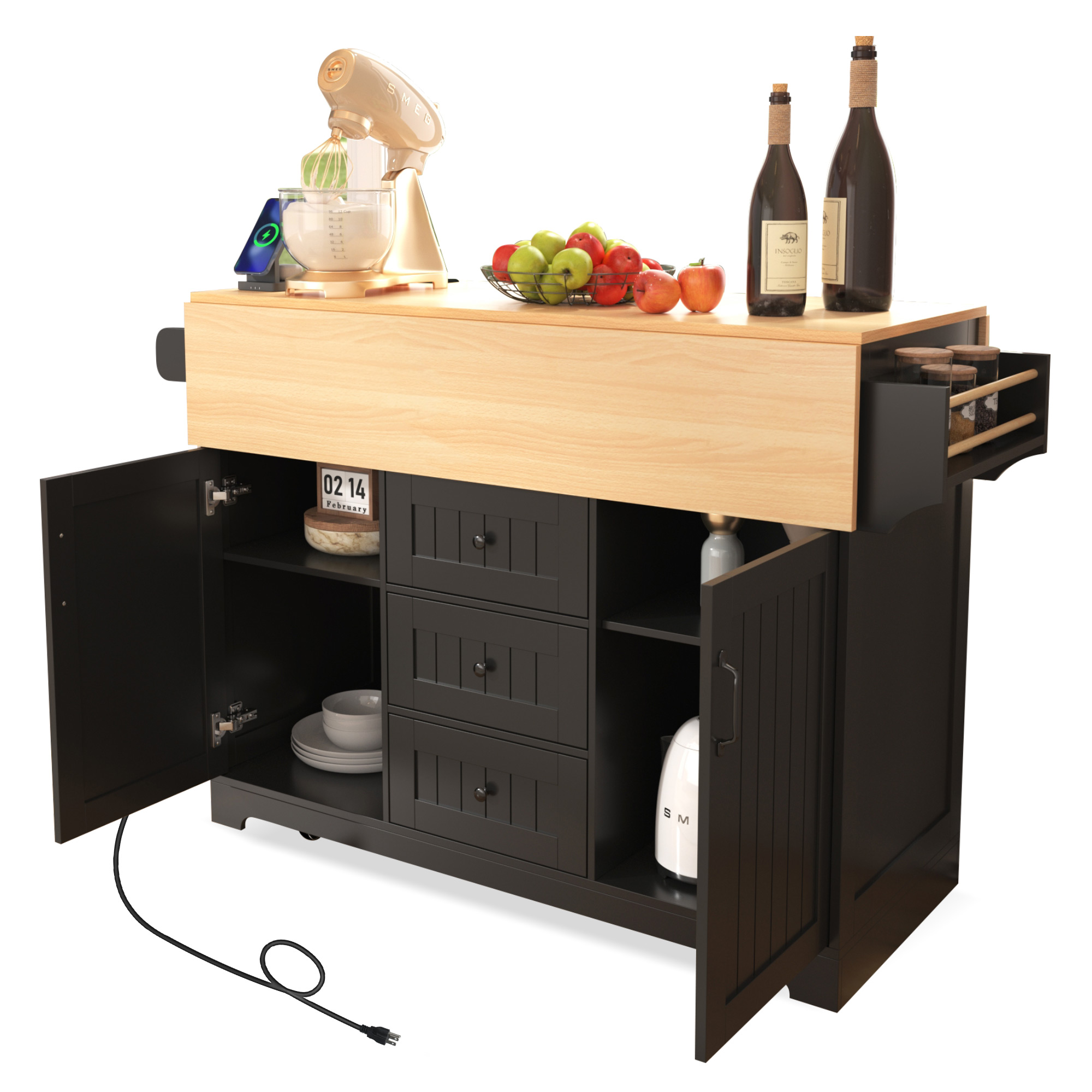 K&K 55.7 Large Kitchen Island With 2 Drop Leaf,, Rolling Kitchen Cart On 5 Wheels With Power Outlet, Folding Storage Dining Table With Spice & Towel Rack , 3 Drawers, For Kitchen, Dining Room,Black