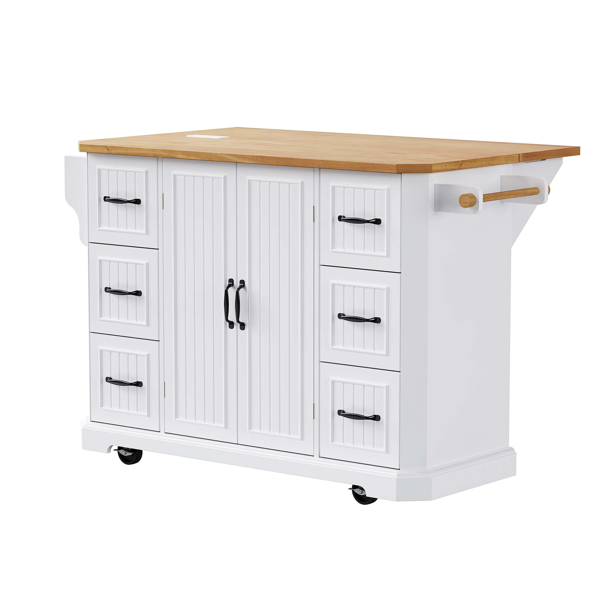 K&K 56 Inch Kitchen Island With Rubber Wood Veneer Drop Leaf, Power Outlet, 4 Door Shelves, Embossed Vertical Stripe Rolling Kitchen Cart On 4 Wheels With 6 Deep Drawers For Kitchen, Dining Room,White