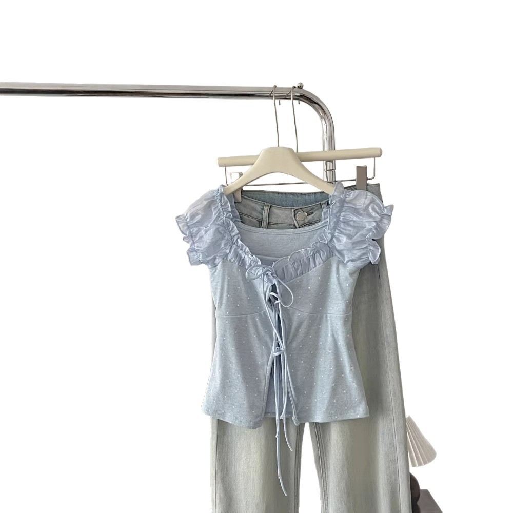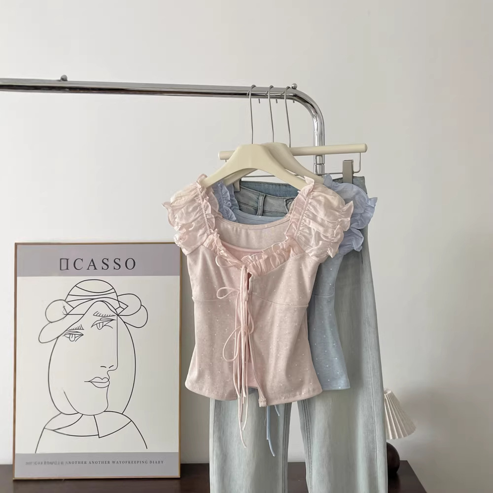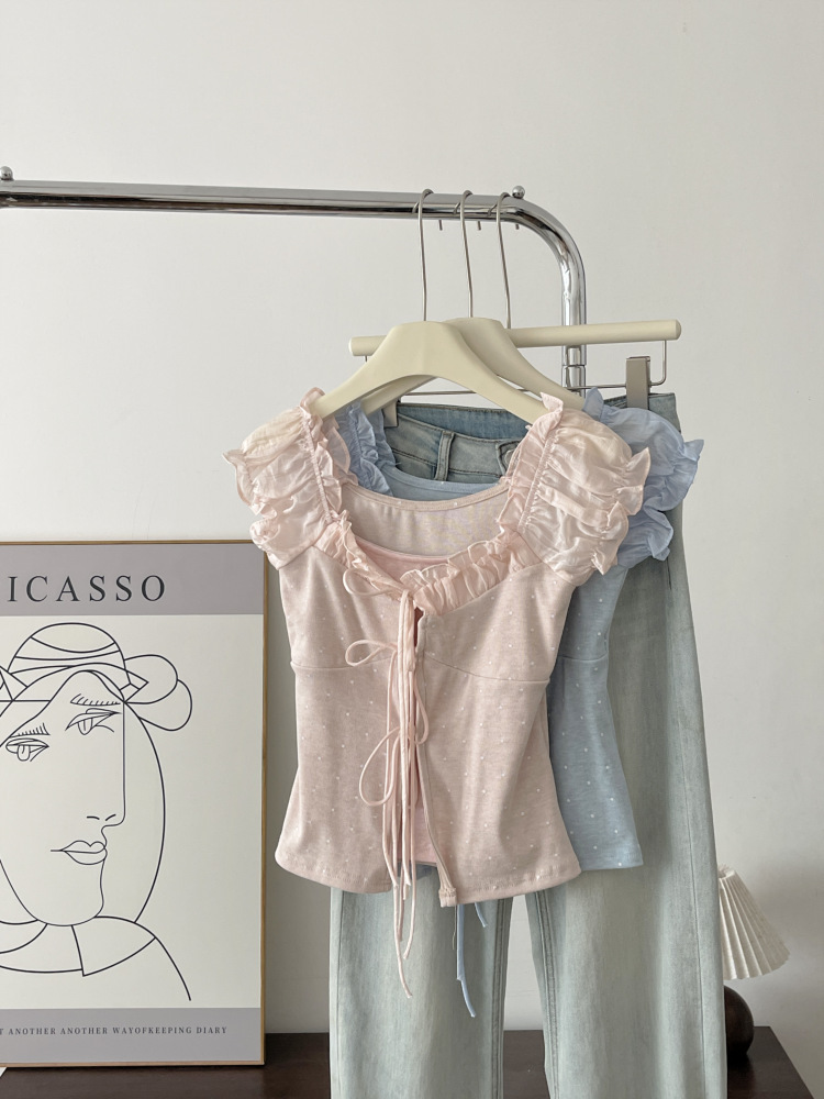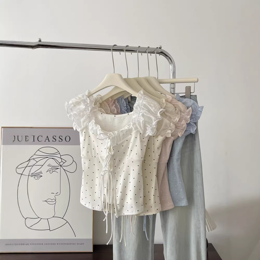 Lace-trimmed Puff-sleeve Polka-dot Short-sleeve Womens Top is designed for style, comfort, and everyday use.
