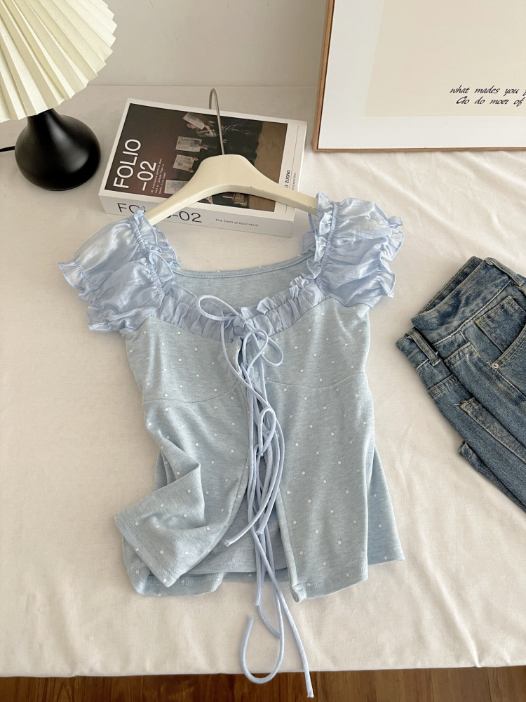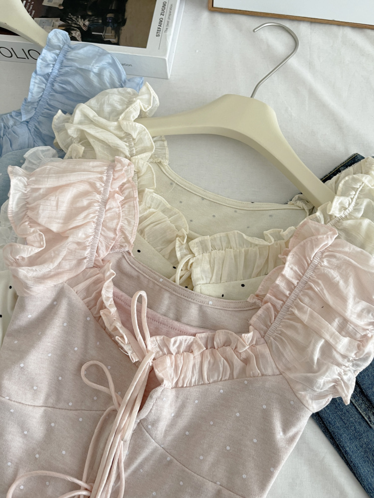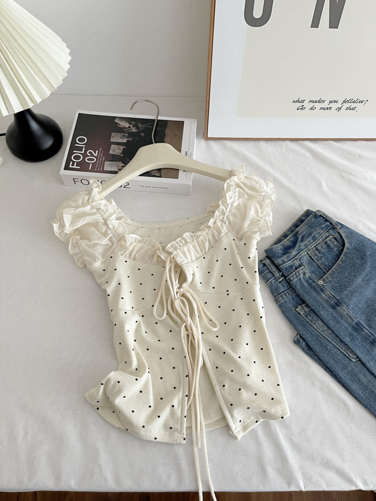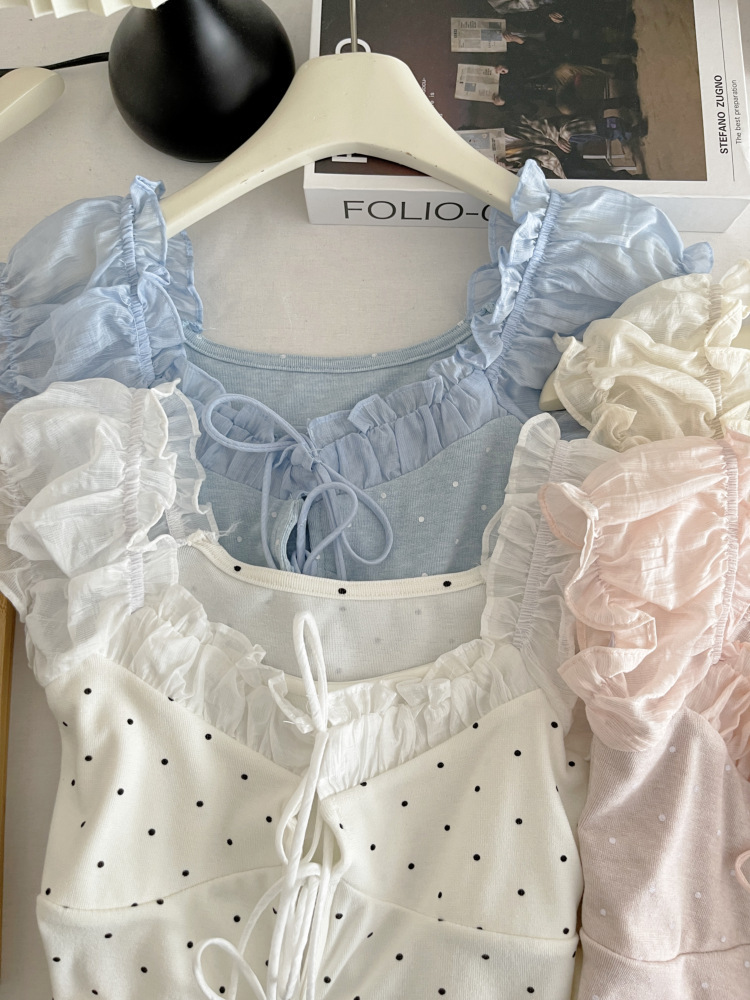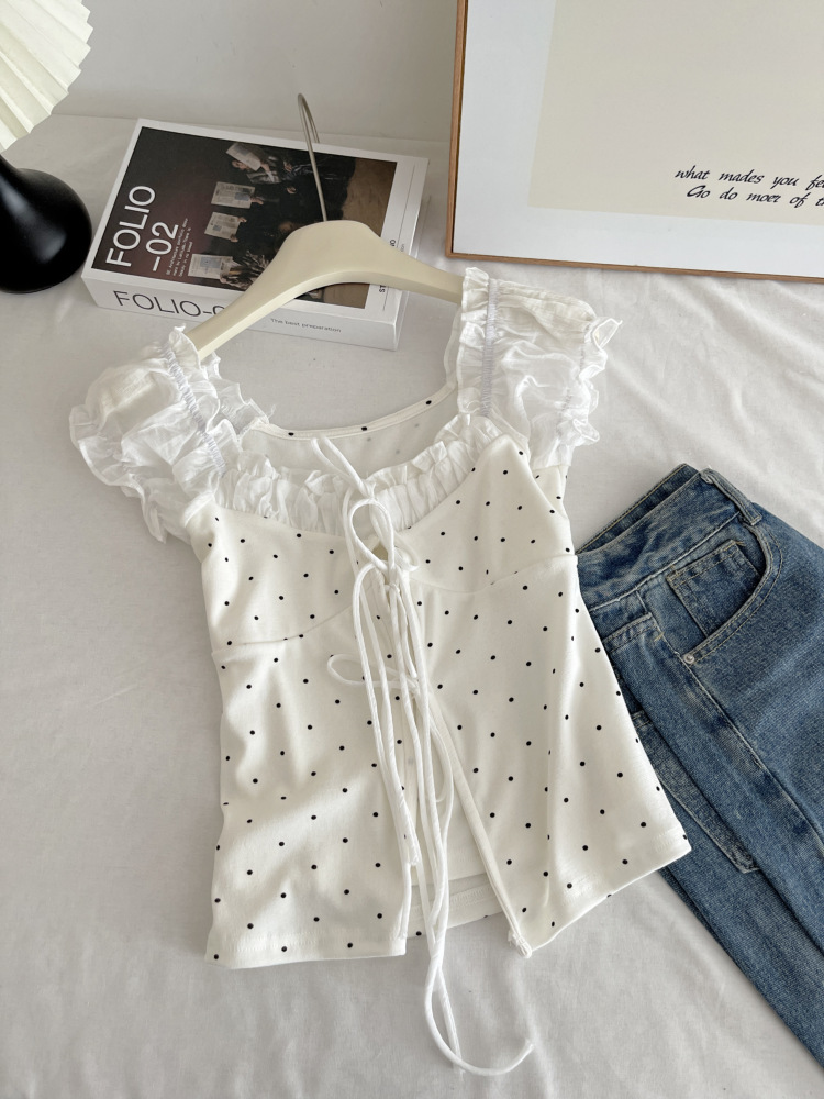 Lace-trimmed Puff-sleeve Polka-dot Short-sleeve Womens Top