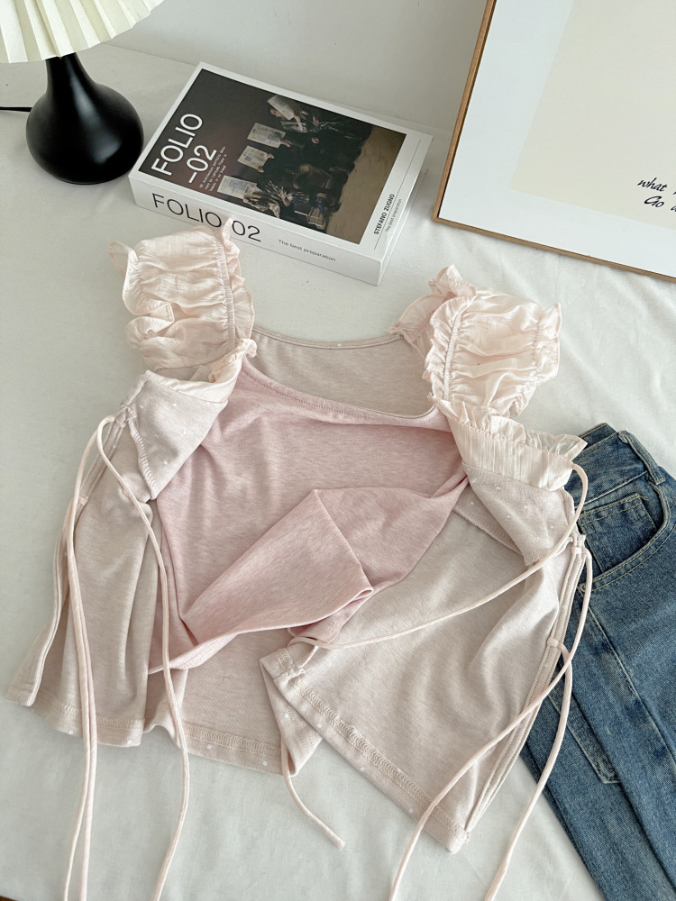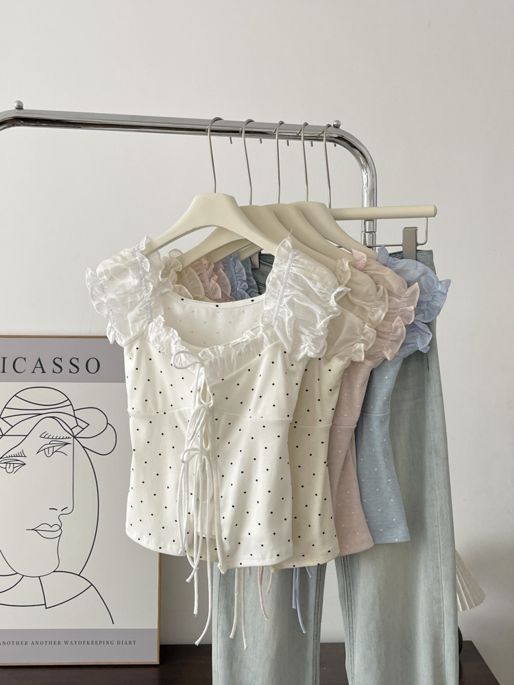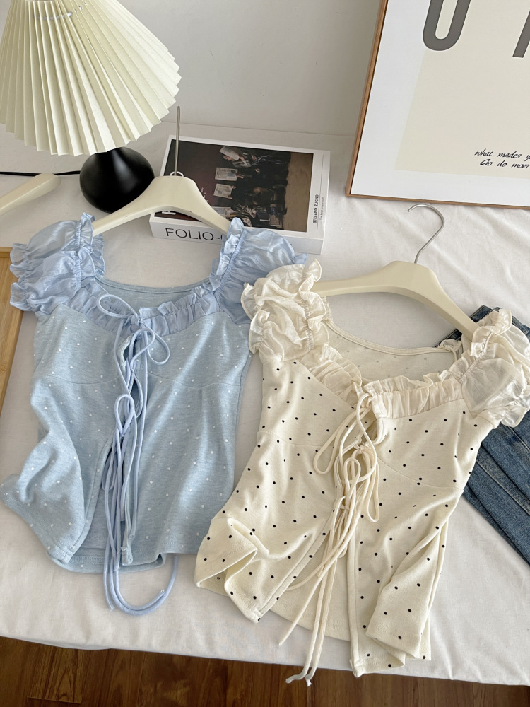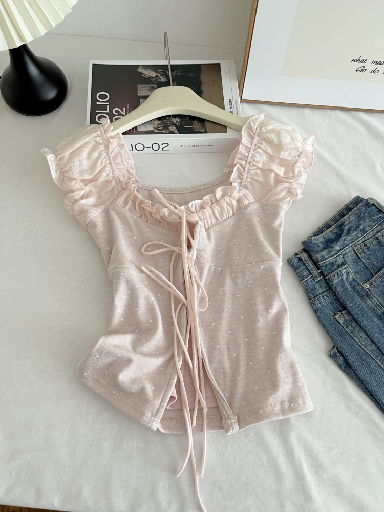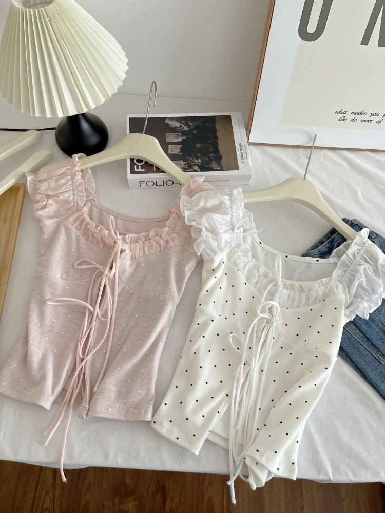 Lace-trimmed Puff-sleeve Polka-dot Short-sleeve Womens Top