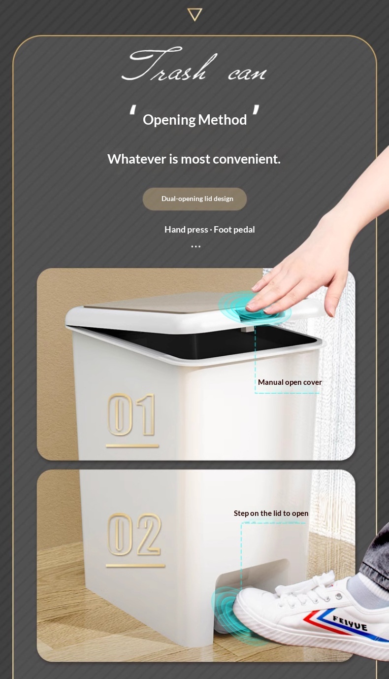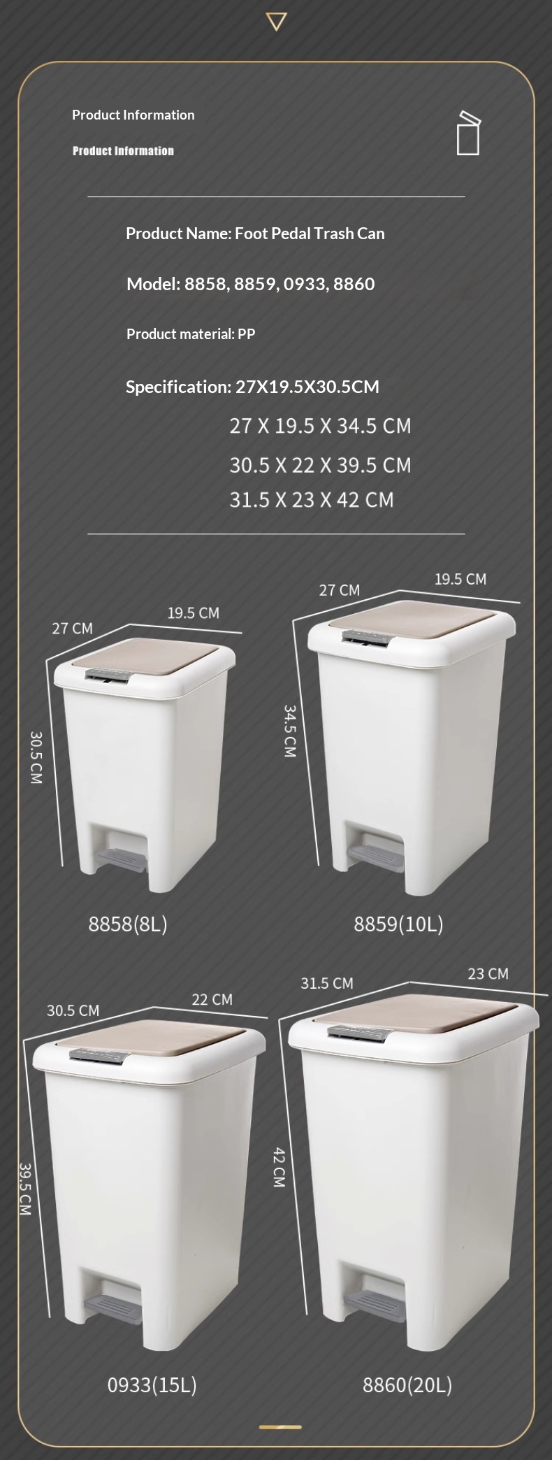• [6.5L] – Double lid with hand press/foot pedal, [8L] – Double lid with hand press/foot pedal, [10L] – Double lid with hand press/foot pedal, [15L] – Double lid with hand press/foot pedal, [20L] – Double lid with hand press/foot pedal
