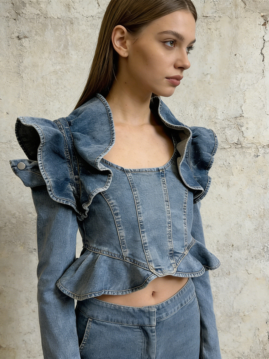 Long-sleeved Cropped Denim Jacket With Ruffled Hem