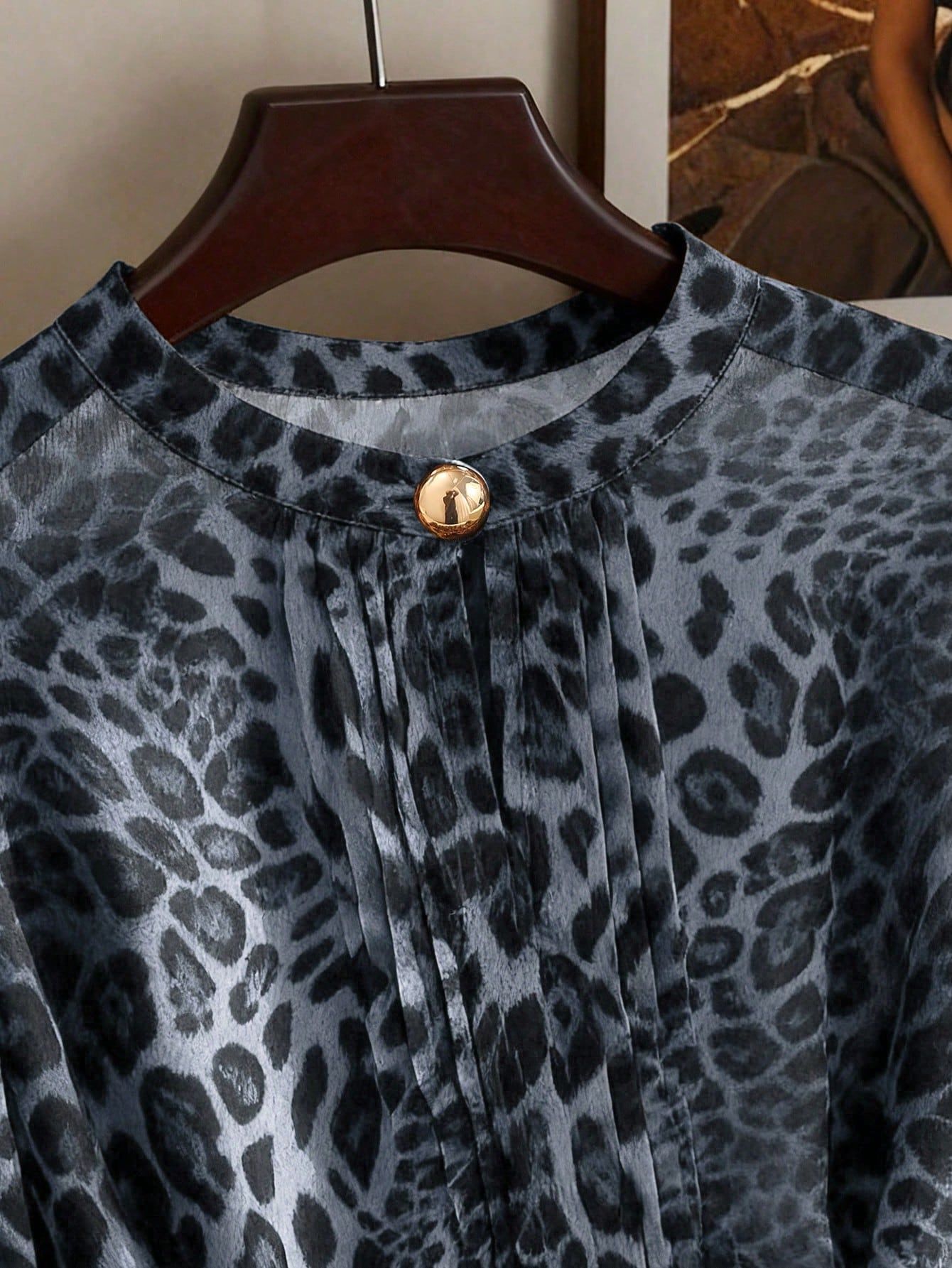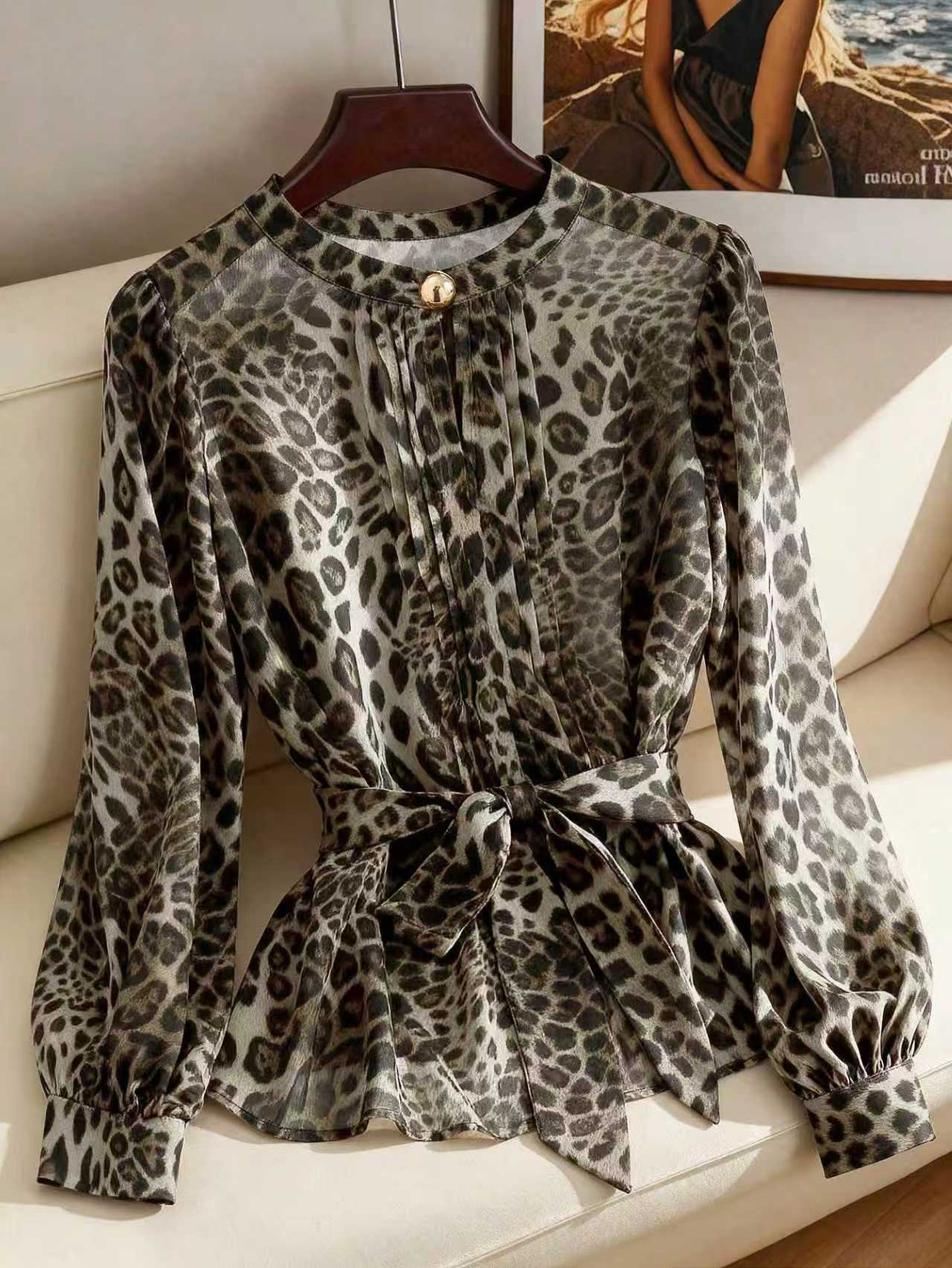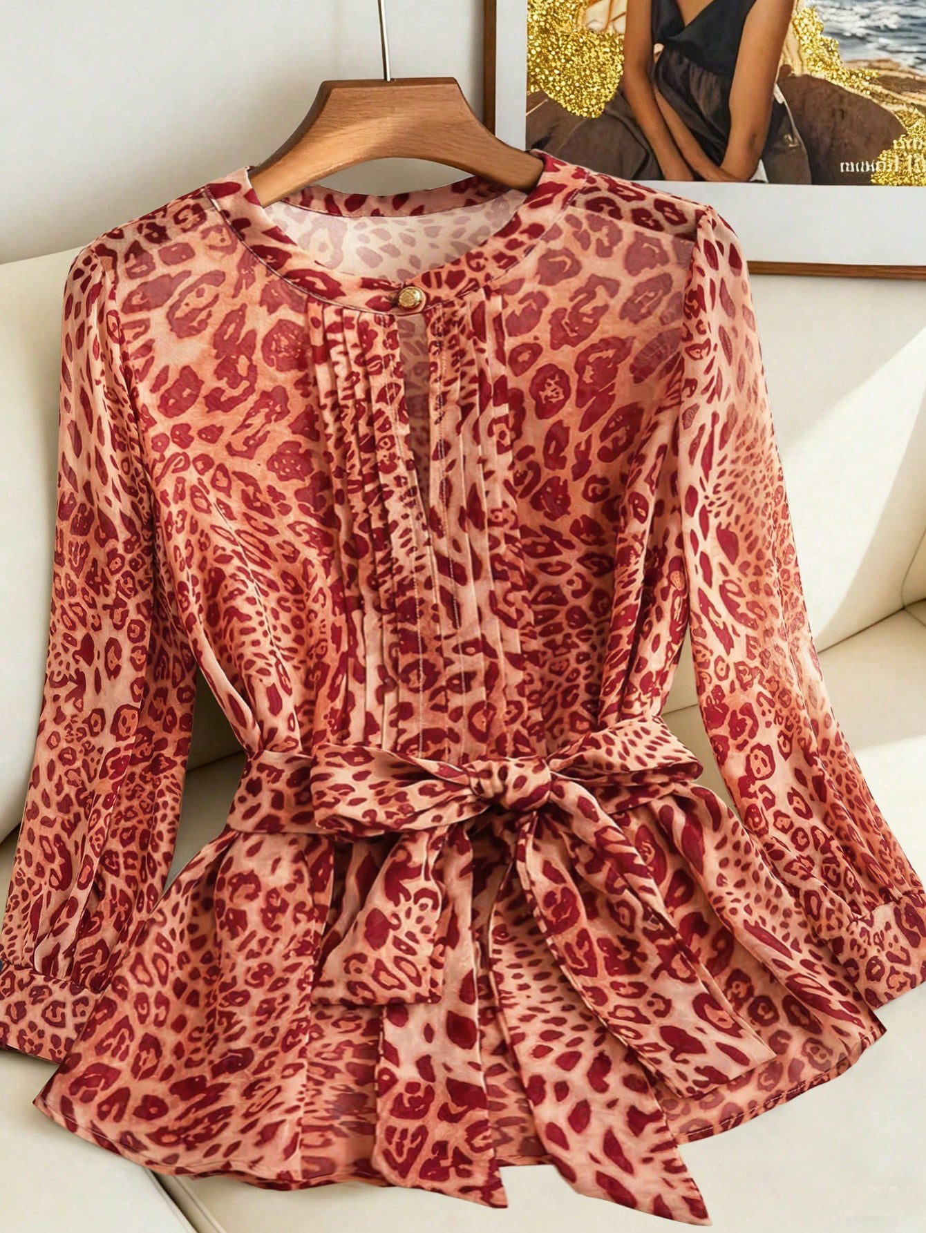 Western/European Style • Animal print, pleated detailing, wrinkle-resistant finish, raglan sleeves, front-button knit top, relaxed fit • Long Sleeve
